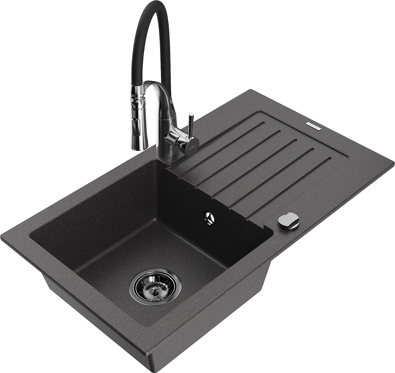 Mexen Pablo granieten spoelbak met 1 bak en afdruiprek en keukenmengkraan Aster, zwart gespikkeld - 6510-76-73450-07-B