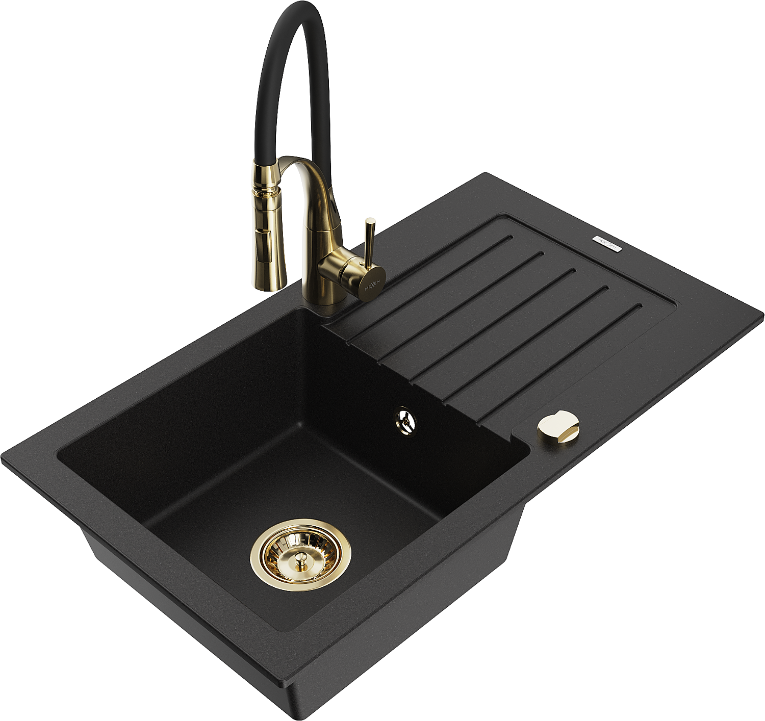 Mexen Pablo granieten spoelbak met 1 bak en afdruipblad en keukenkraan Aster, zwart - 6510-77-73450-57-G