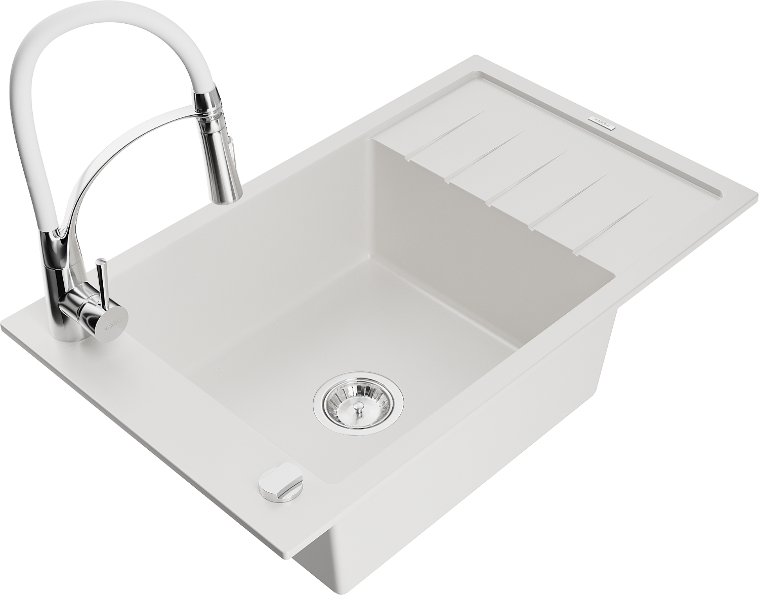 Mexen Elias granieten spoelbak 1-kompartment met afdruiprek en keukenmengkraan Aster, wit - 6511-20-73450-02