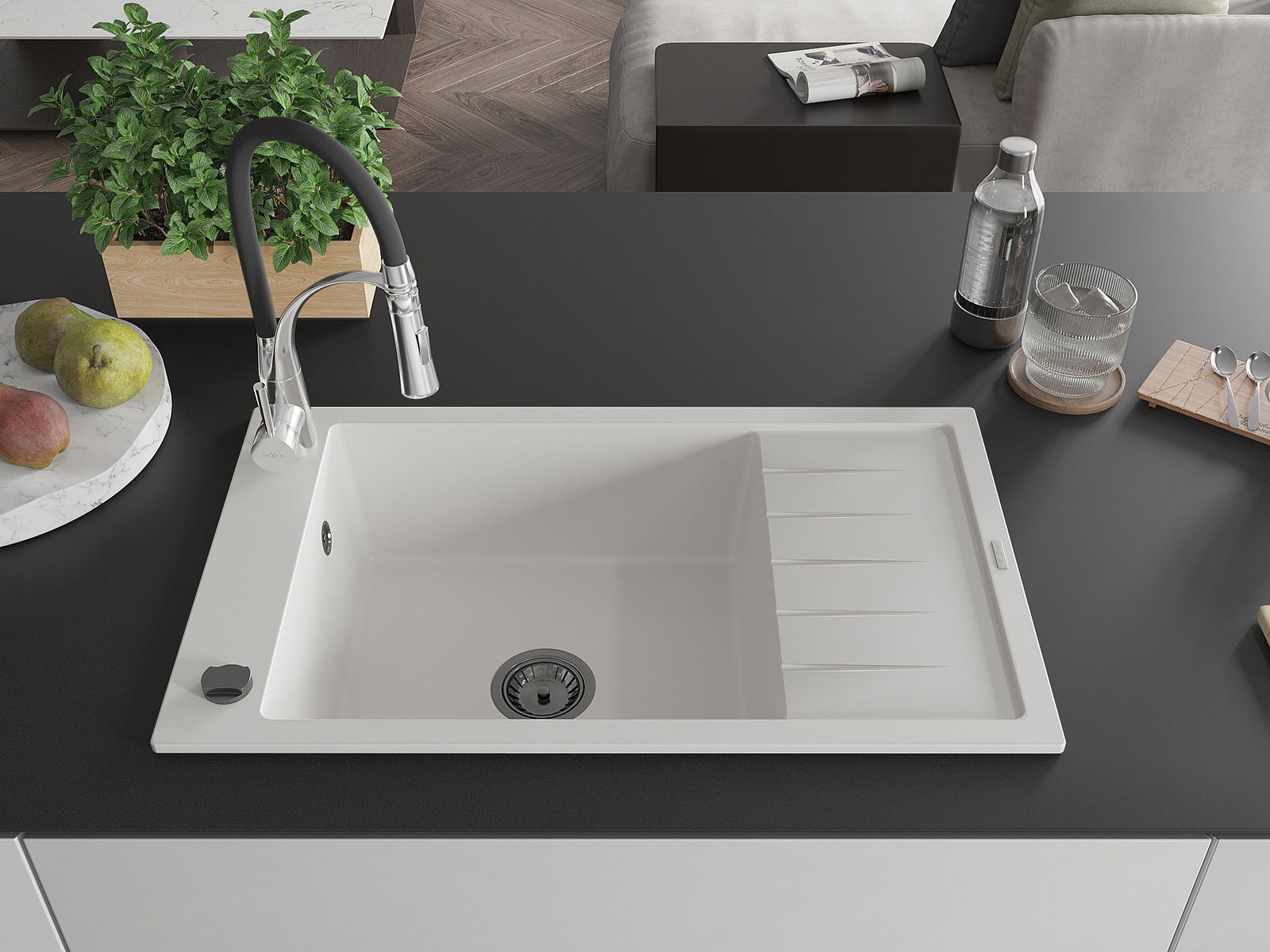 Mexen Elias granieten gootsteen 1-comparteer met druiprek en keukenmengkraan Aster, wit - 6511-20-73450-07-B