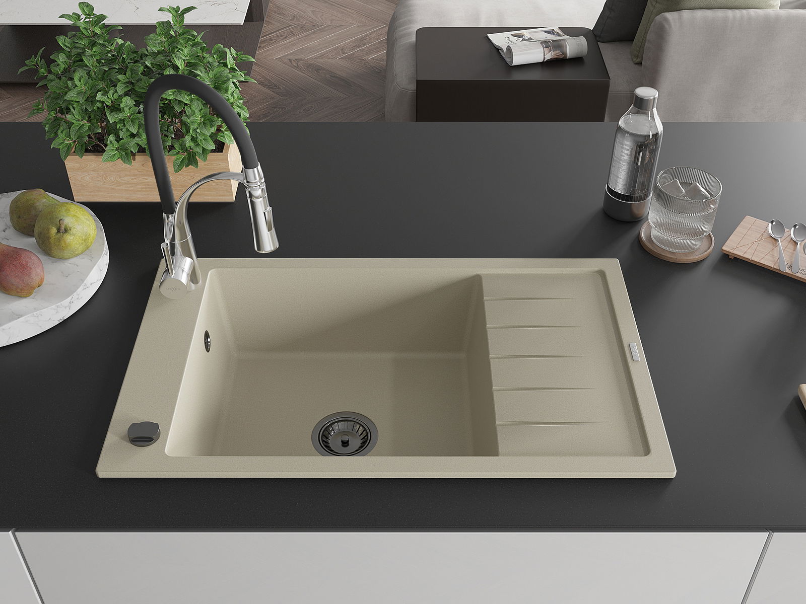 Mexen Elias granieten spoelbak met 1 bak en afdruiprek en keukenkraan Aster, beige - 6511-69-73450-07-B