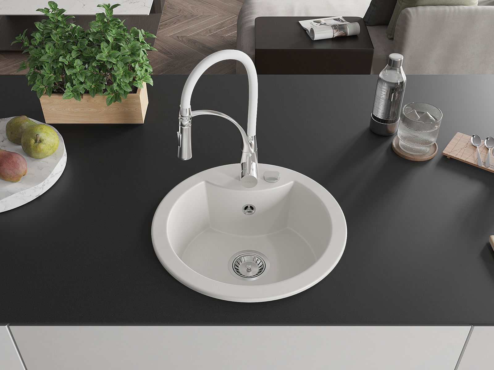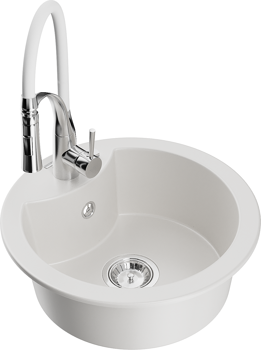 De spoelbak heeft een voorgesneden gat met een diameter van 35 mm voor eenvoudige verwijdering. Dit gat kan bijvoorbeeld worden gebruikt om een vloeistofdispenser te installeren, waardoor plastic flessen in de keuken overbodig zijn en een elegante afwerking ontstaat.