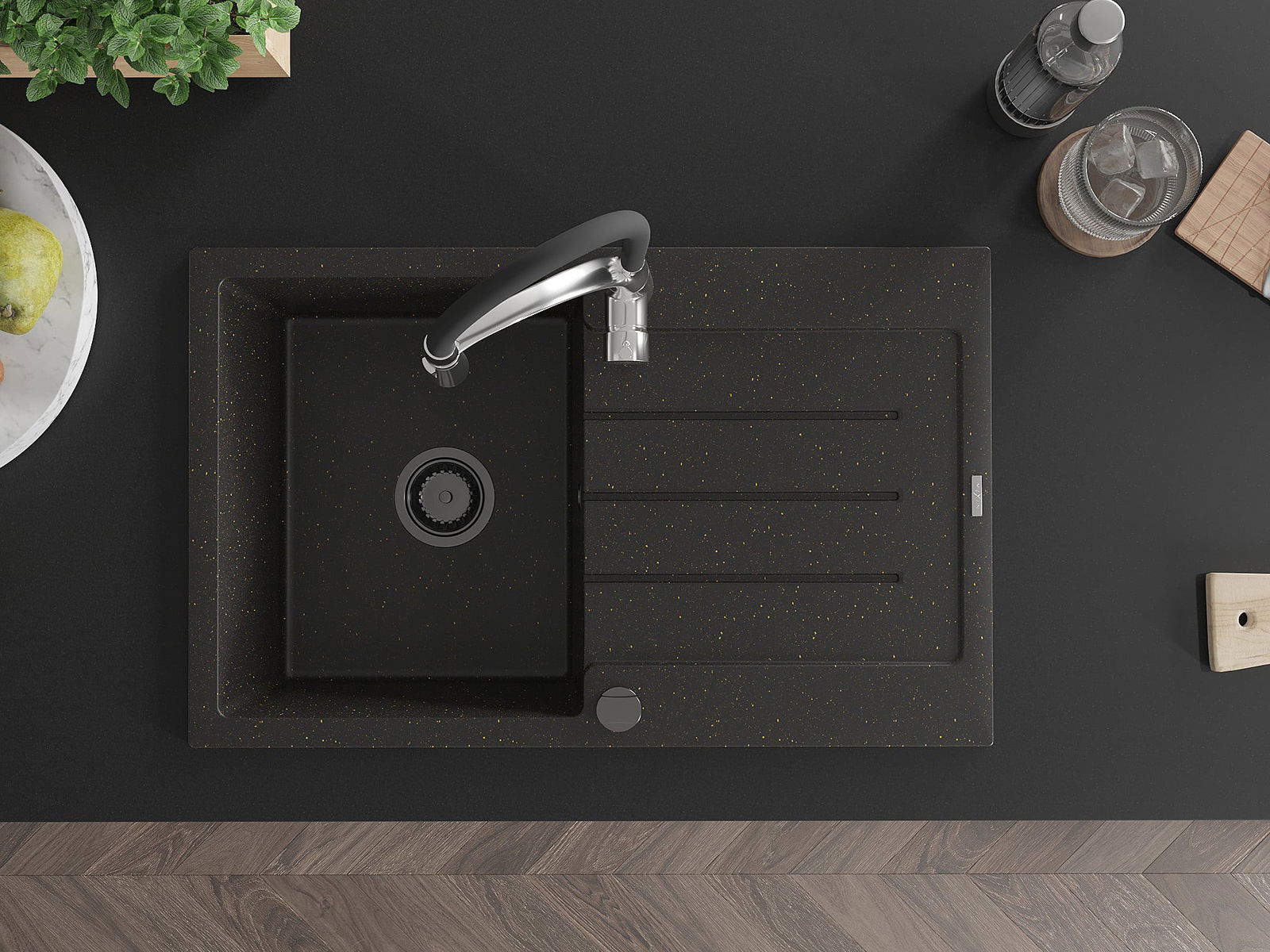 Mexen Bruno granieten gootsteen 1-bak met afdruiprek en keukenmengkraan Aster, zwart/goud metallic - 6513-75-73450-07-B