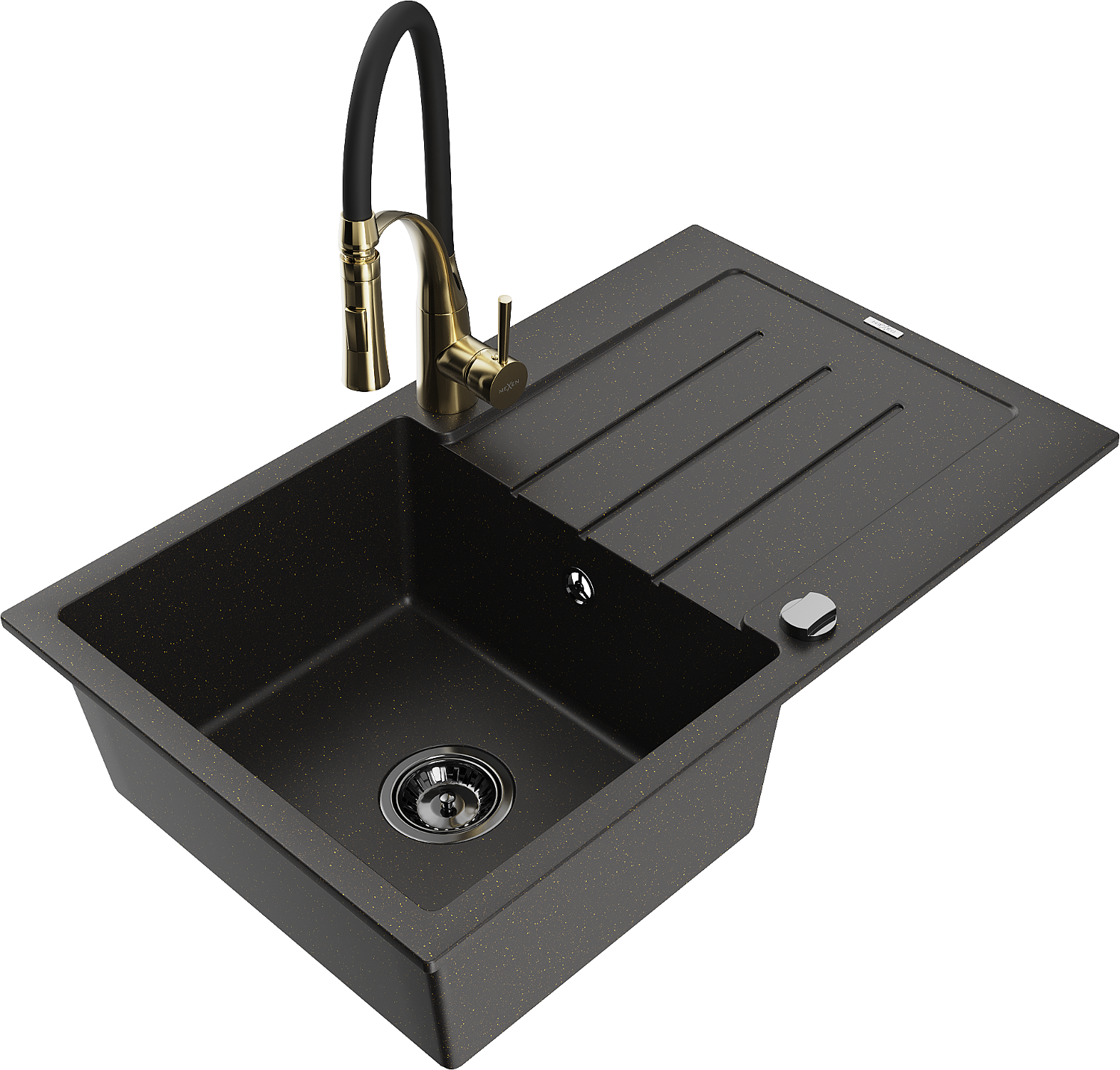 Mexen Bruno granieten gootsteen 1-komorige met afdruipplaat en keukenkraan Aster, zwart/goud metallic - 6513-75-73450-57-B