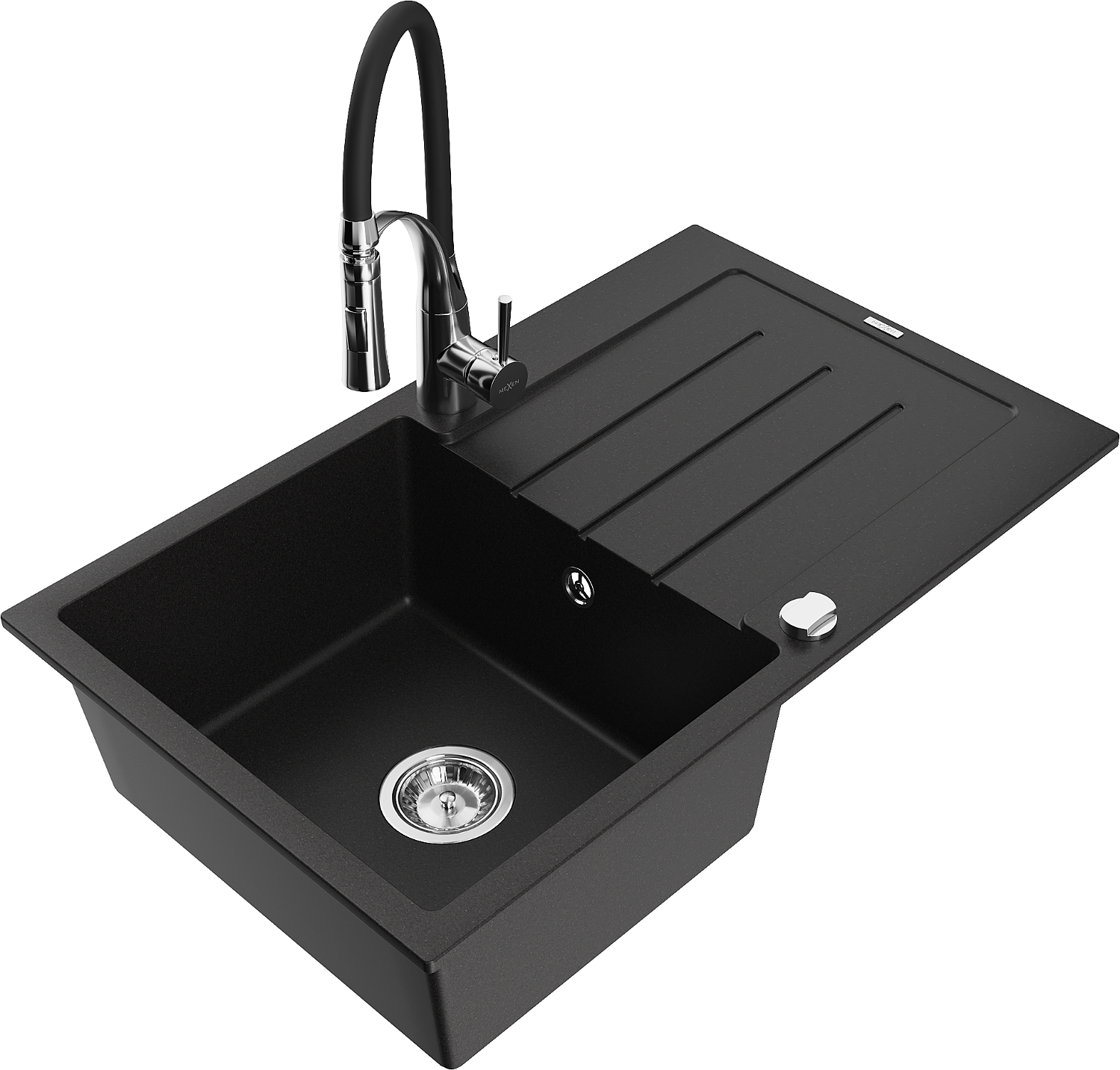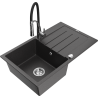 Mexen Bruno granieten 1-komorige spoelbak met afdruiprek en keukenmengkraan Aster, zwart - 6513-77-73450-07