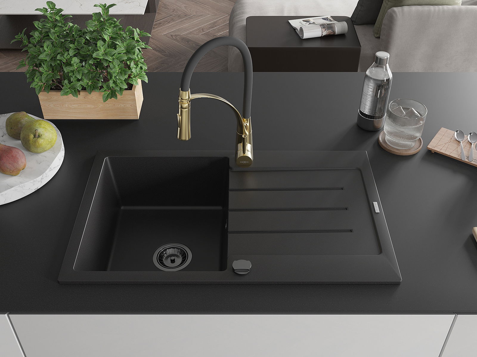 Mexen Bruno granieten gootsteen 1-compartiment met afdruiprek en keukenkraan Aster, zwart - 6513-77-73450-57-B
