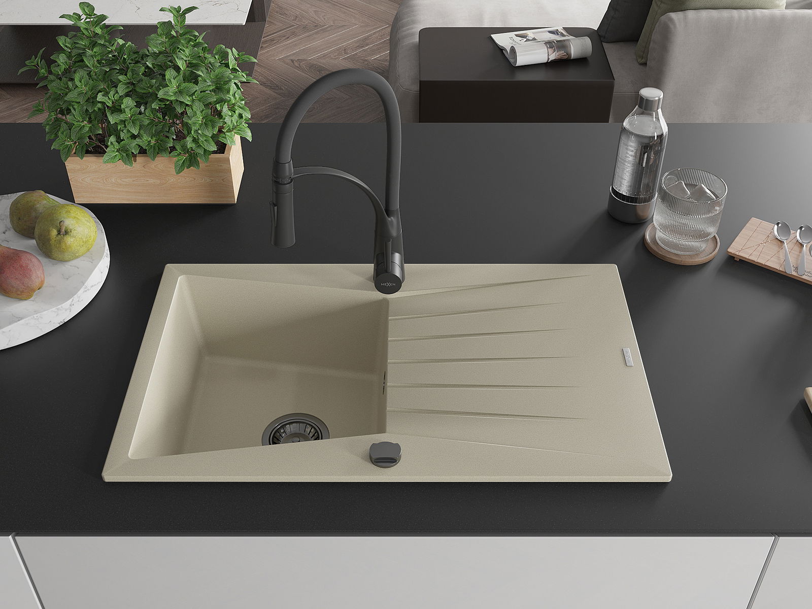 Mexen Cesar granieten spoelbak met 1 bak en afdruiprek en keukenmengkraan Aster, beige - 6514-69-73450-70-B