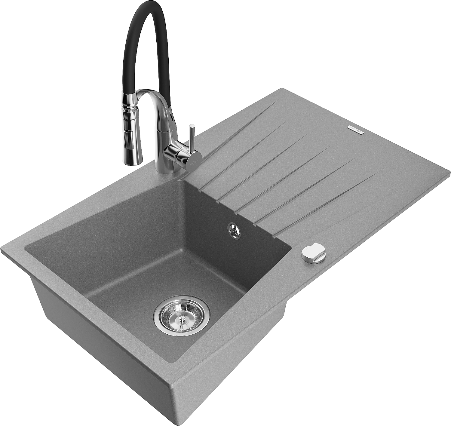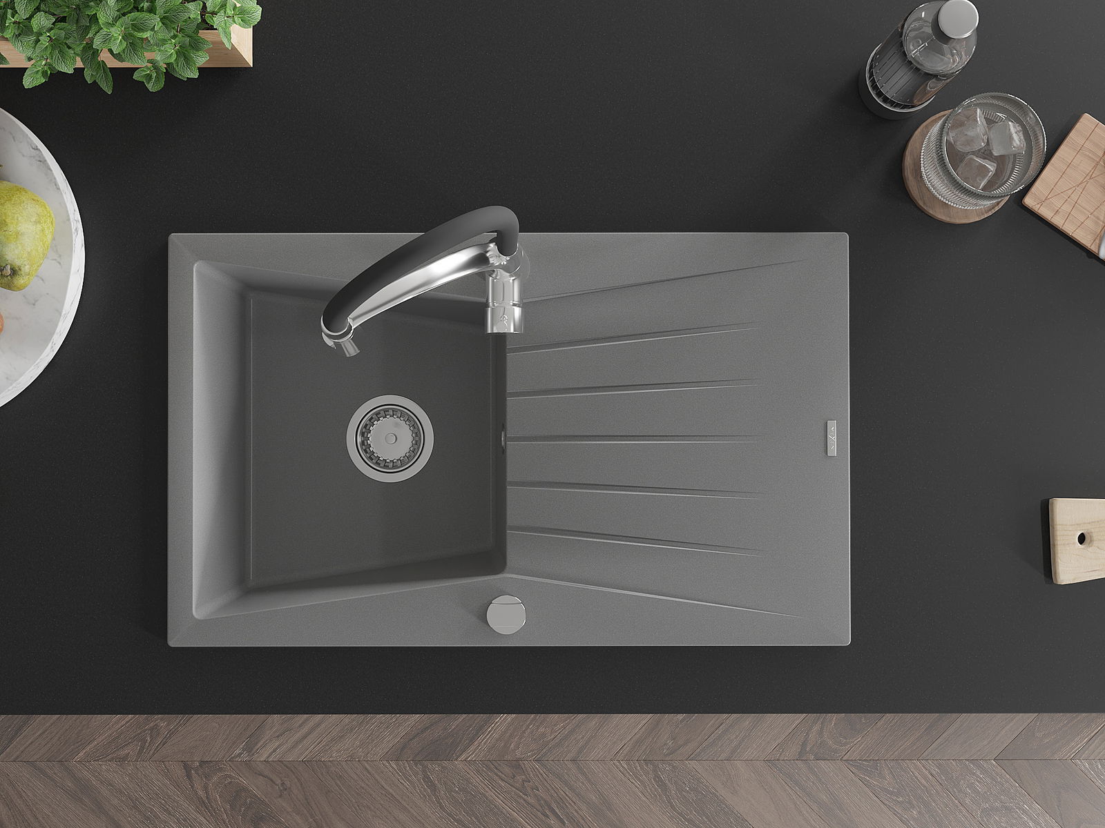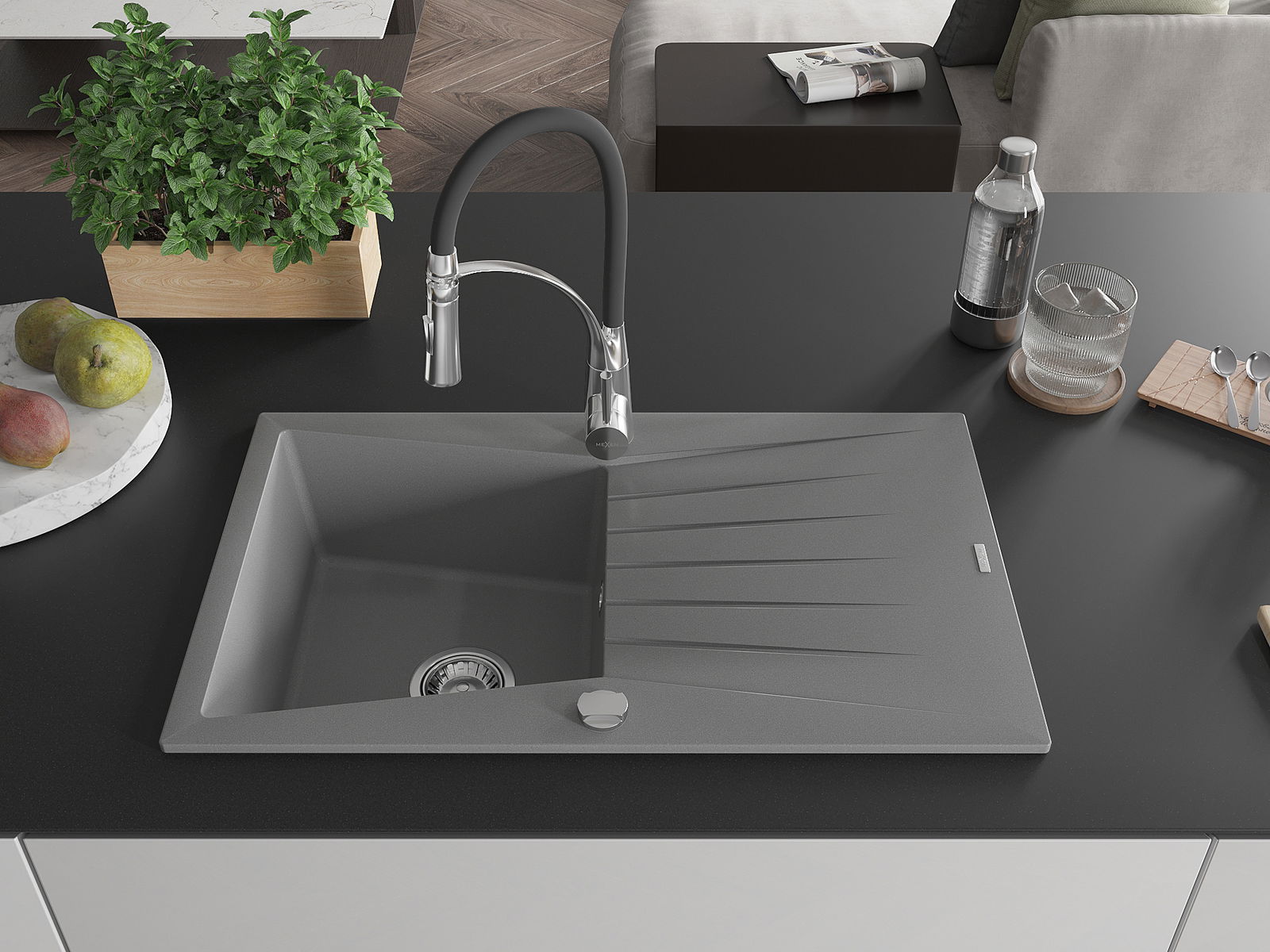 Mexen Cesar granieten spoelbak met 1 bak met afdruiprek en keukenmengkraan Aster, grijs - 6514-71-73450-07