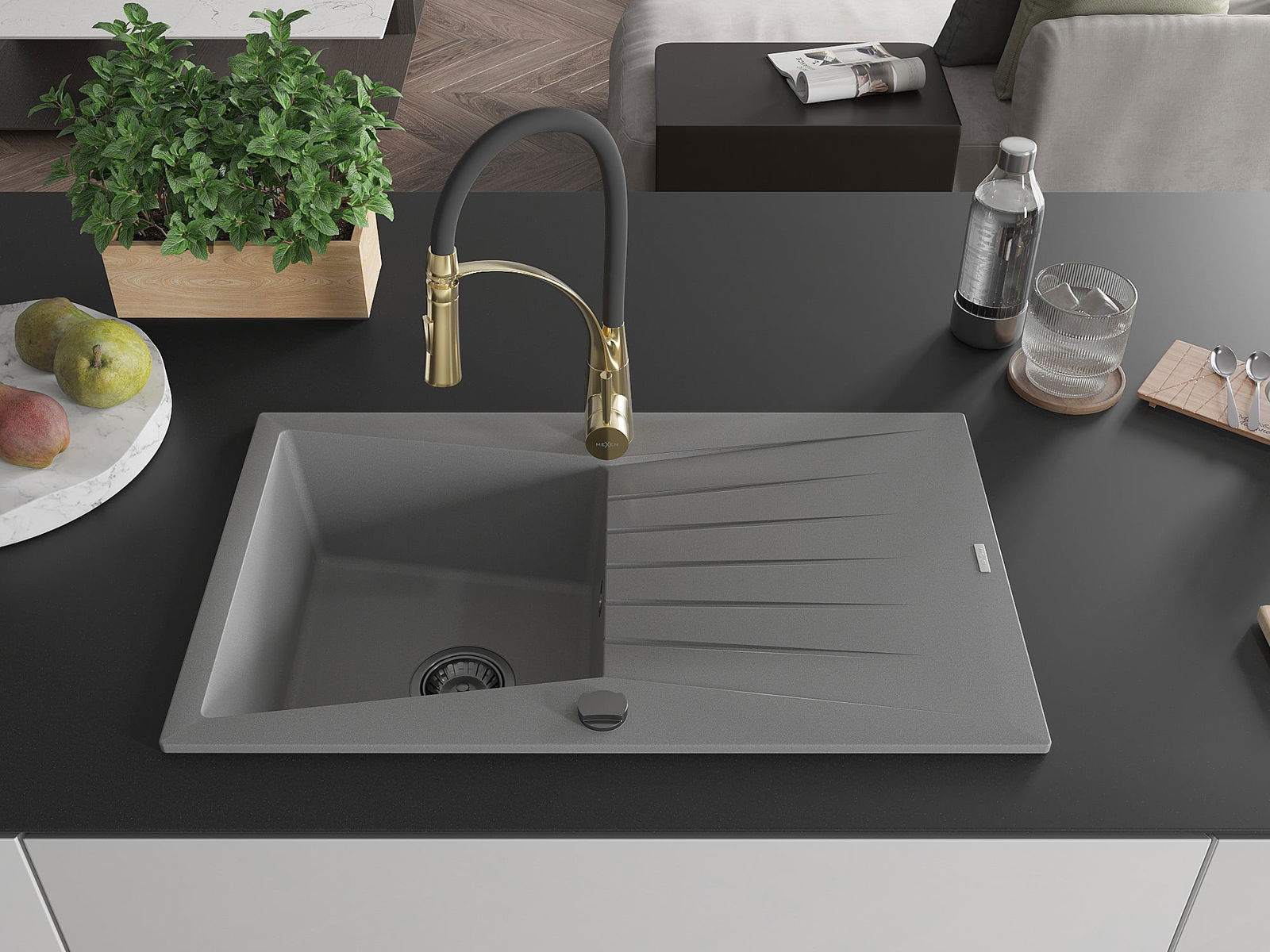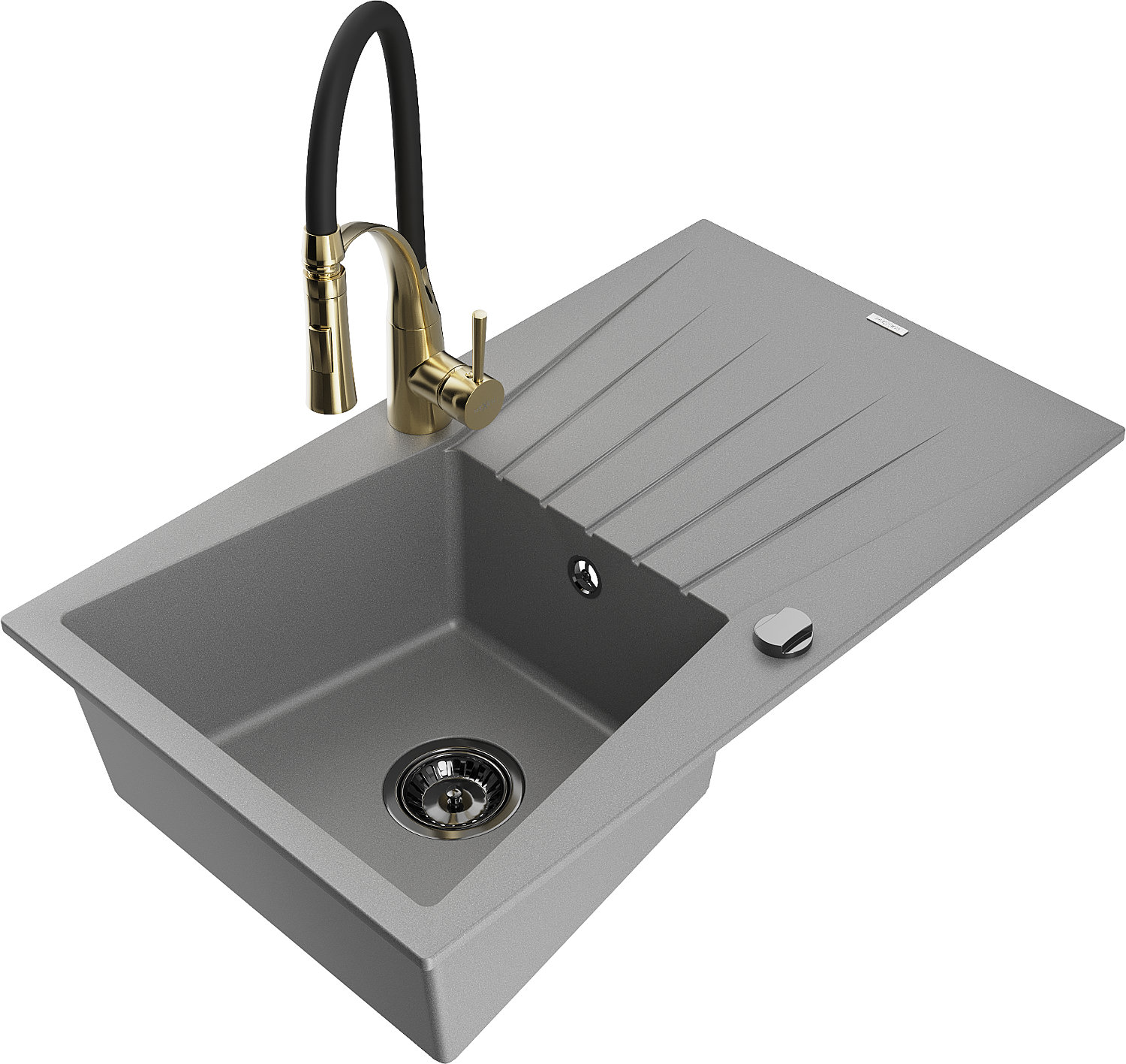 Mexen Cesar granieten gootsteen 1-komor met afdruiprek en keukenmengkraan Aster, grijs - 6514-71-73450-57-B