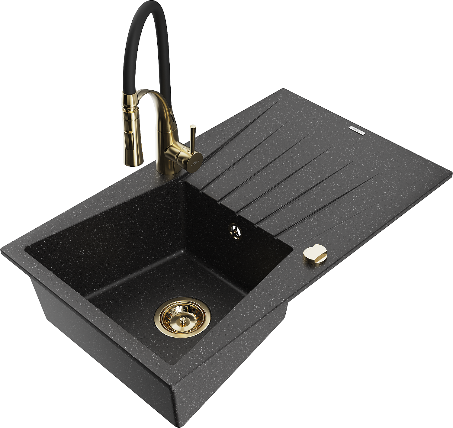 Mexen Cesar granitstenen gootsteen met 1 bak en afdruiprek en keukenmengkraan Aster, zwart/zilver metallic - 6514-73-73450-57-G