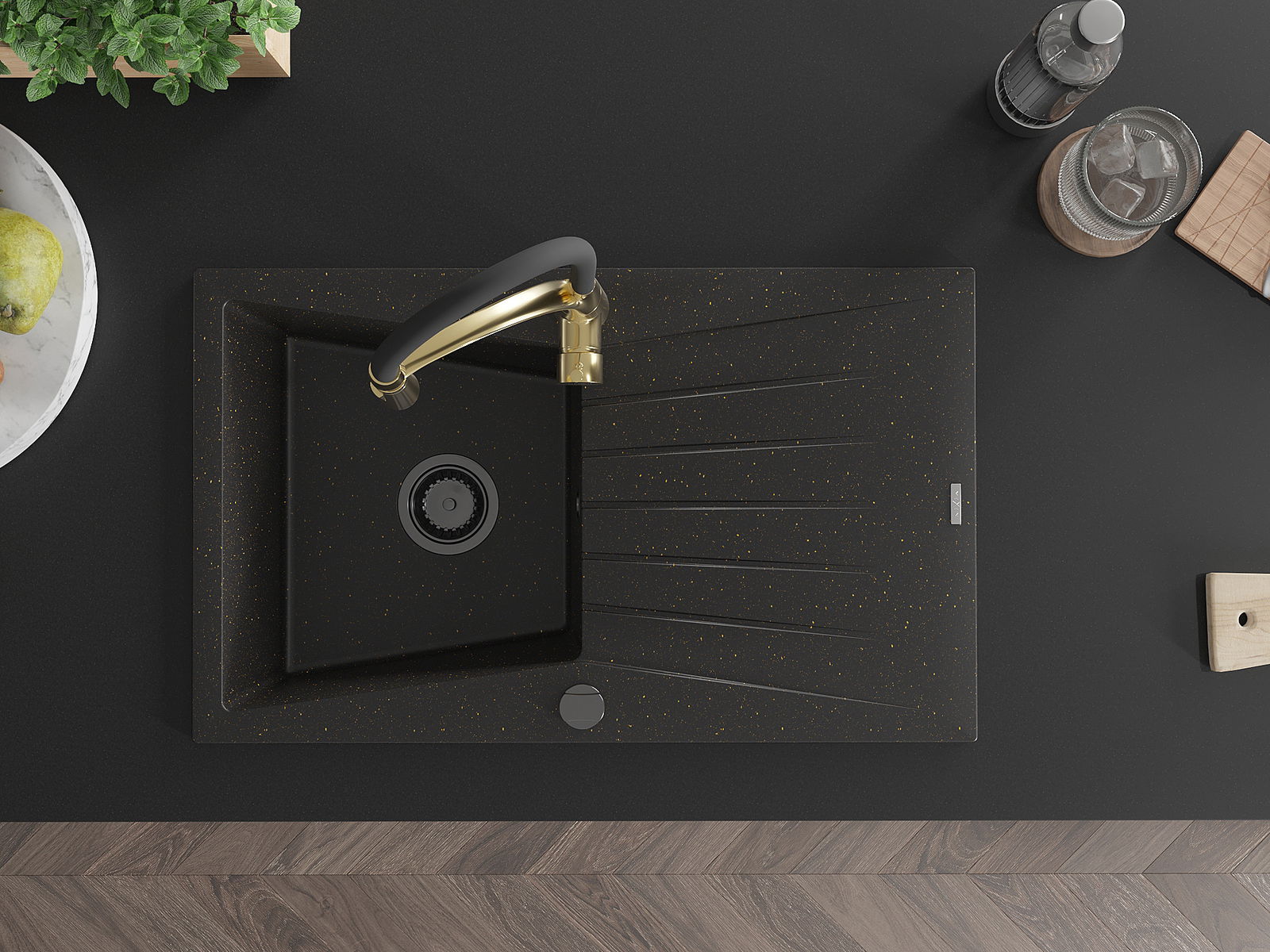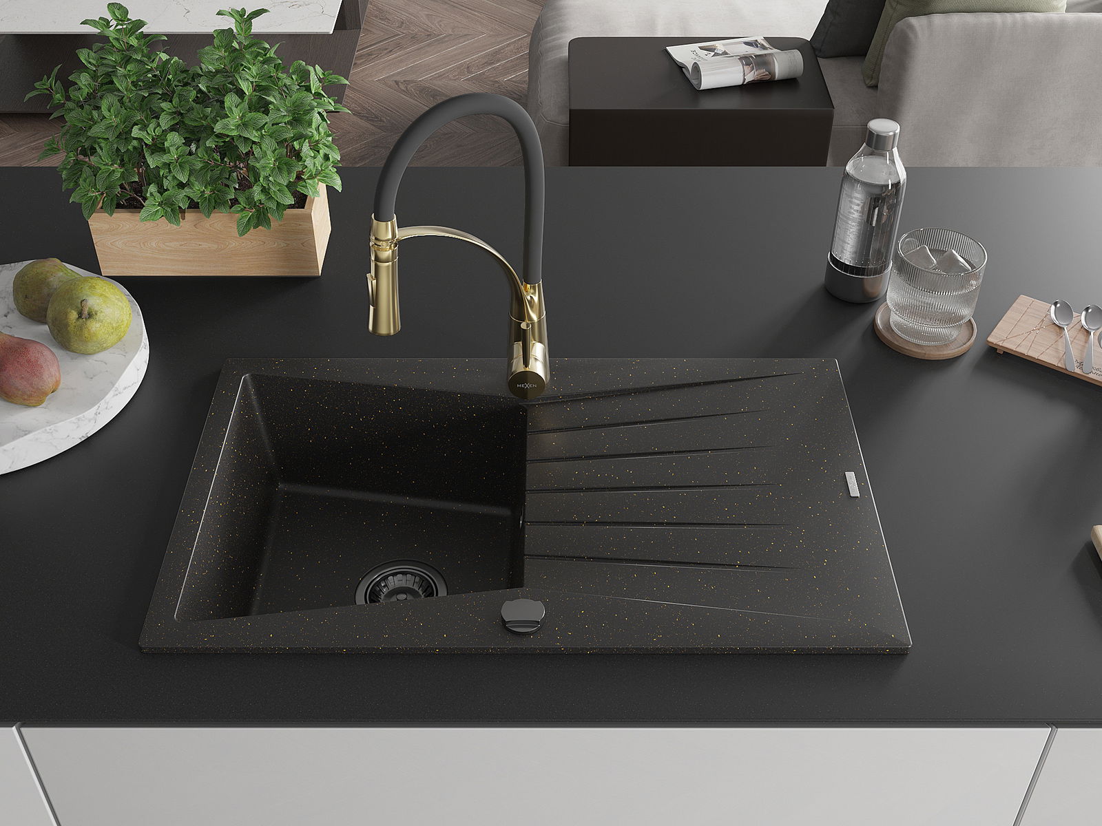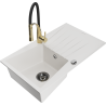 Mexen Cesar granieten spoelbak met 1 bak, afdruiprek en keukenkraan Aster, zwart/goud metallic - 6514-75-73450-57-B