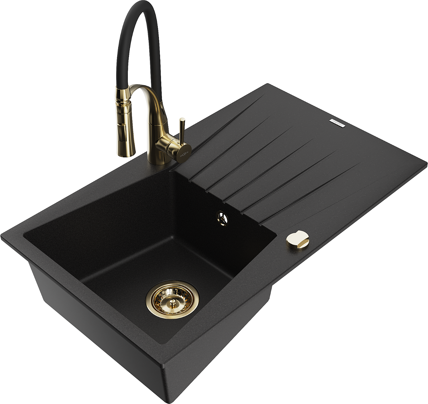 Mexen Cesar granieten spoelbak met 1 bak en afdruiprek en Aster keukenkraan, zwart - 6514-77-73450-57-G