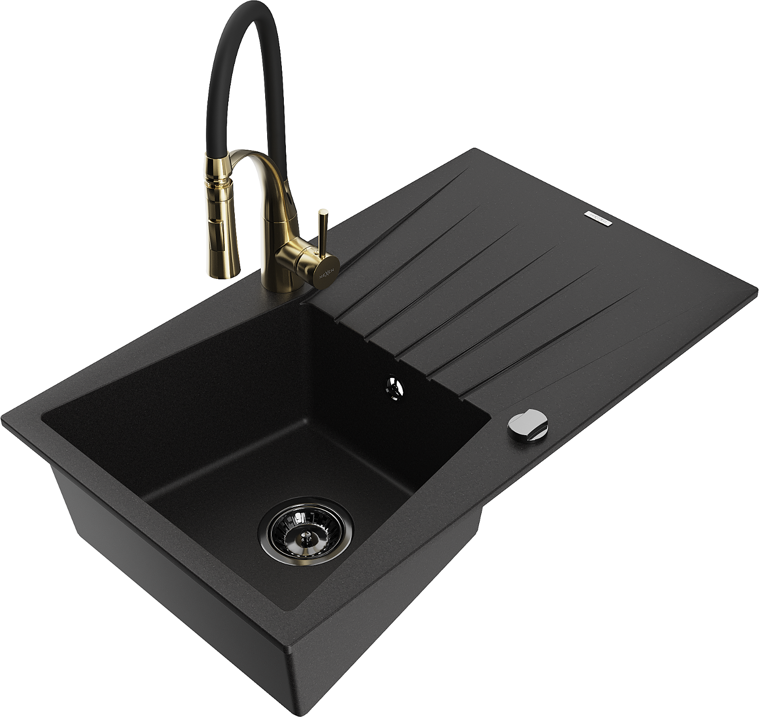 Mexen Cesar granieten spoelbak met 1 kom, afdruiprek en keukenmengkraan Aster, zwart - 6514-77-73450-57-B