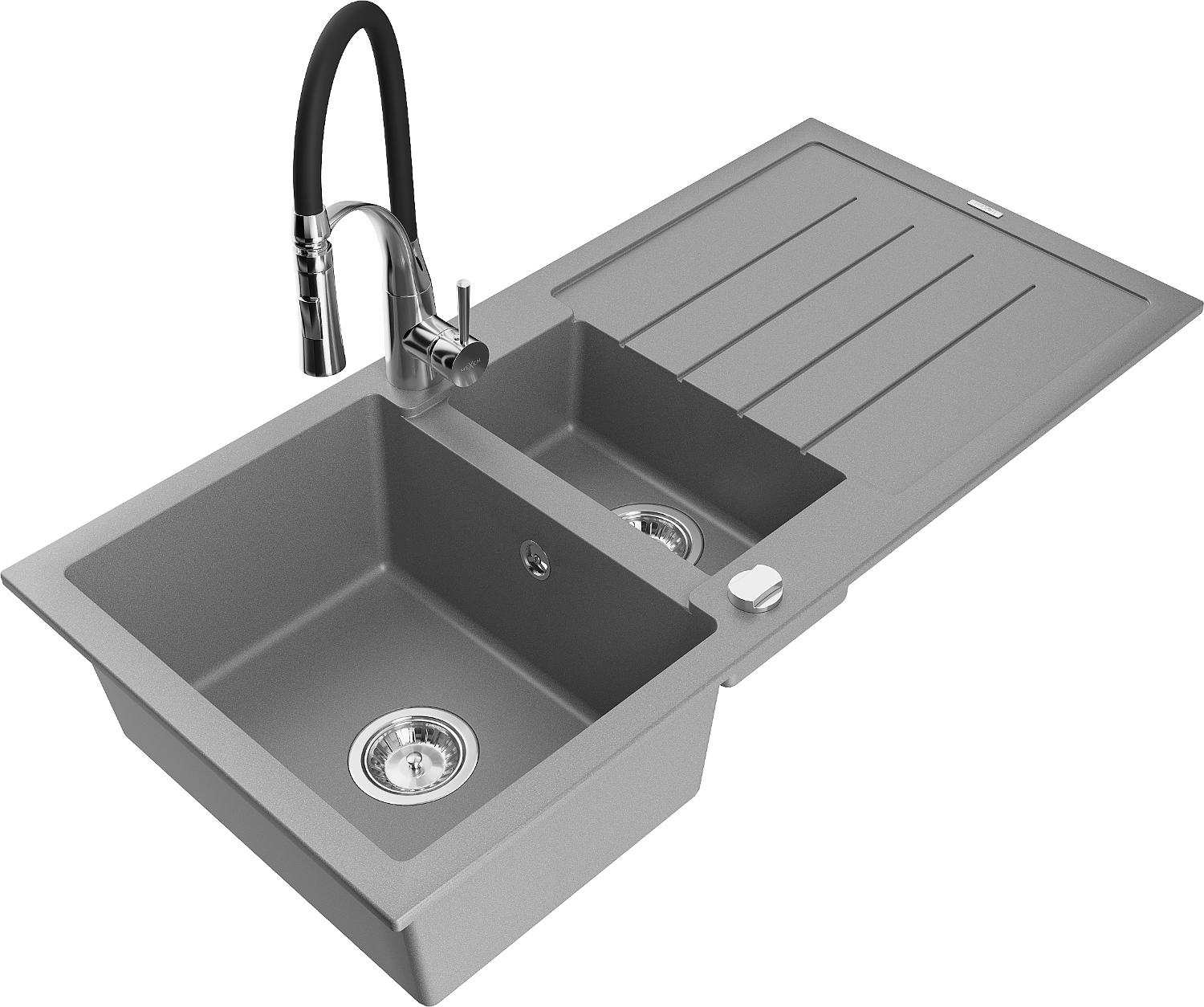 Mexen Andres granieten gootsteen met 1,5 kommetjes met afdruiprek en keukenmengkraan Aster, grijs - 6515-71-73450-07