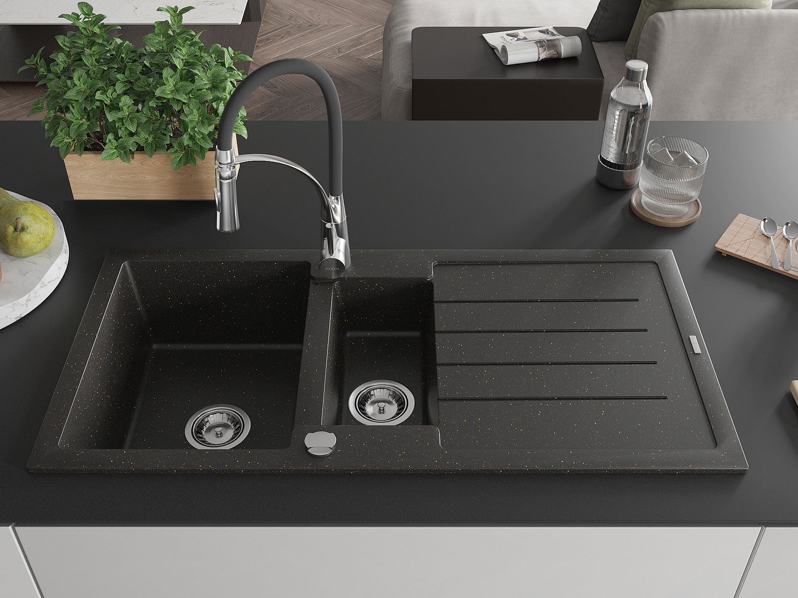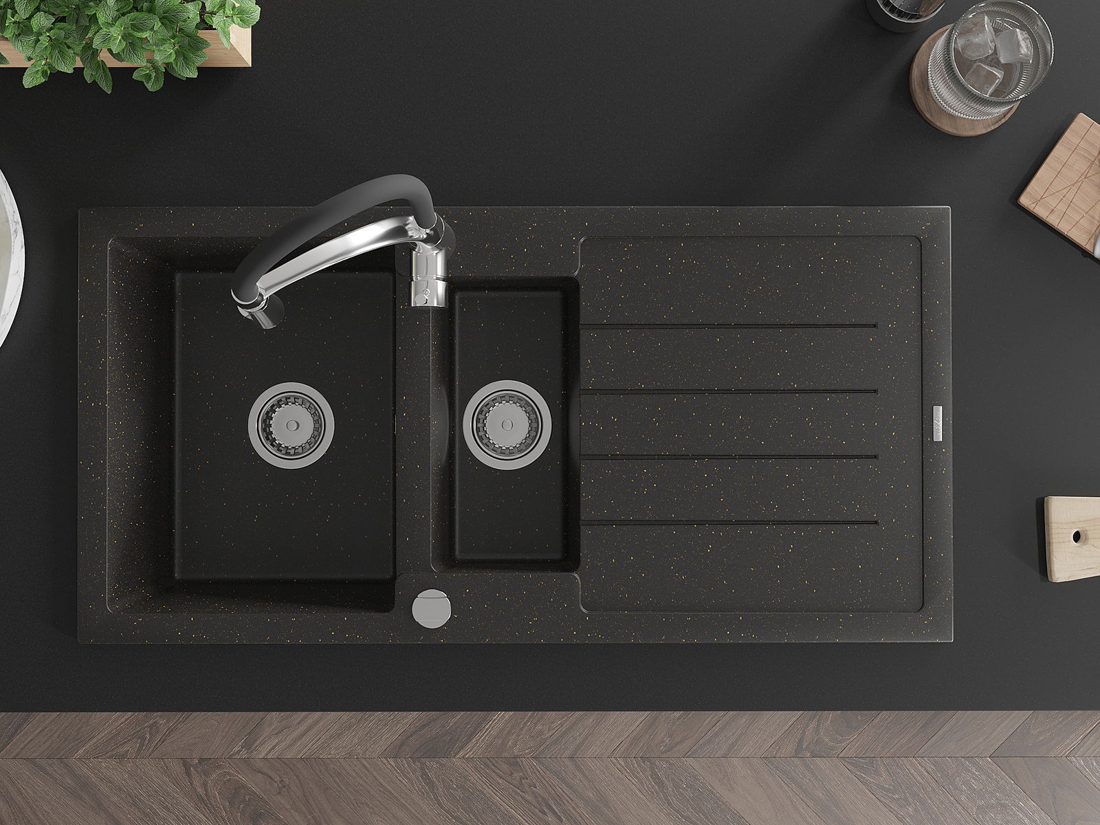 Mexen Andres granieten spoelbak 1,5-kompartiment met afdruiprek en keukenmengkraan Aster, zwart/goud metallic - 6515-75-73450-07