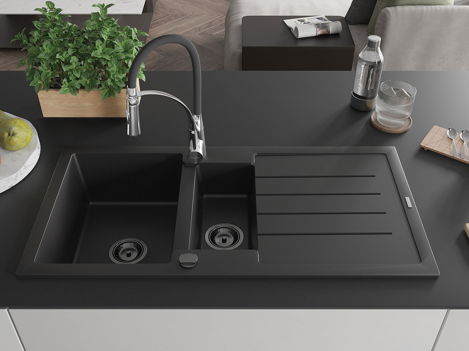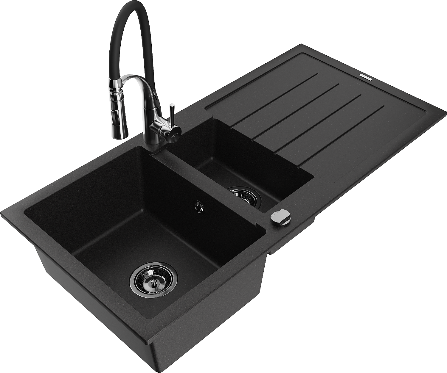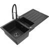 Mexen Andres granieten gootsteen 1,5-kamer met afdruiprek en keukenmengkraan Aster, zwart - 6515-77-73450-07-B
