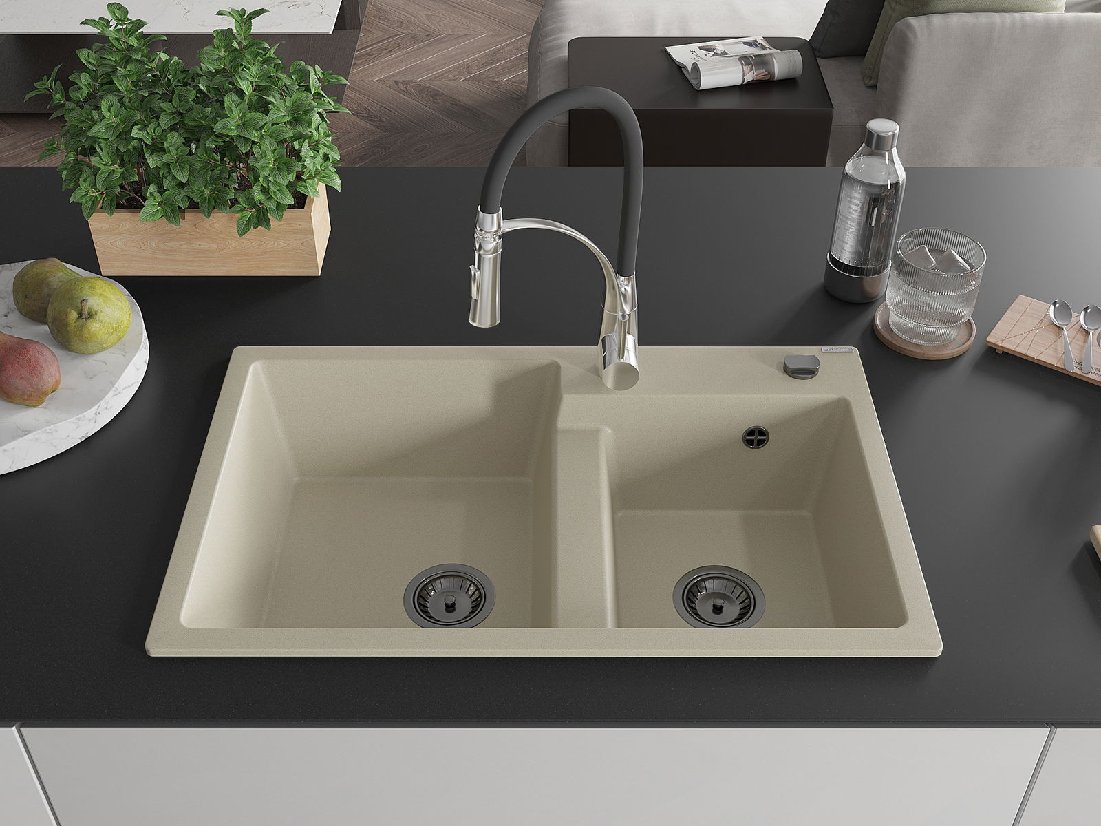 Mexen Tomas granieten spoelbak met 2 compartimenten en Astera keukenmengkraan, beige - 6516-69-73450-07-B