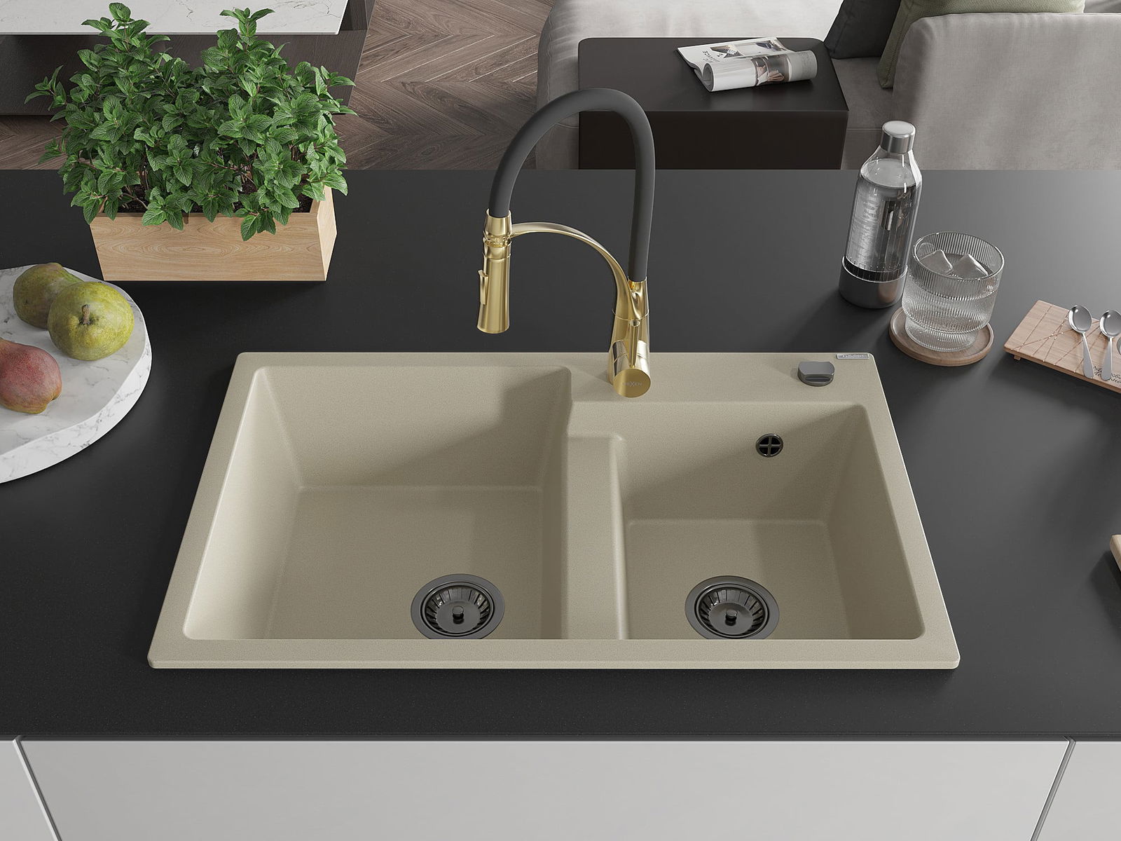 Mexen Tomas granieten gootsteen 2-kamer met keukenmengkraan Aster, beige - 6516-69-73450-57-B