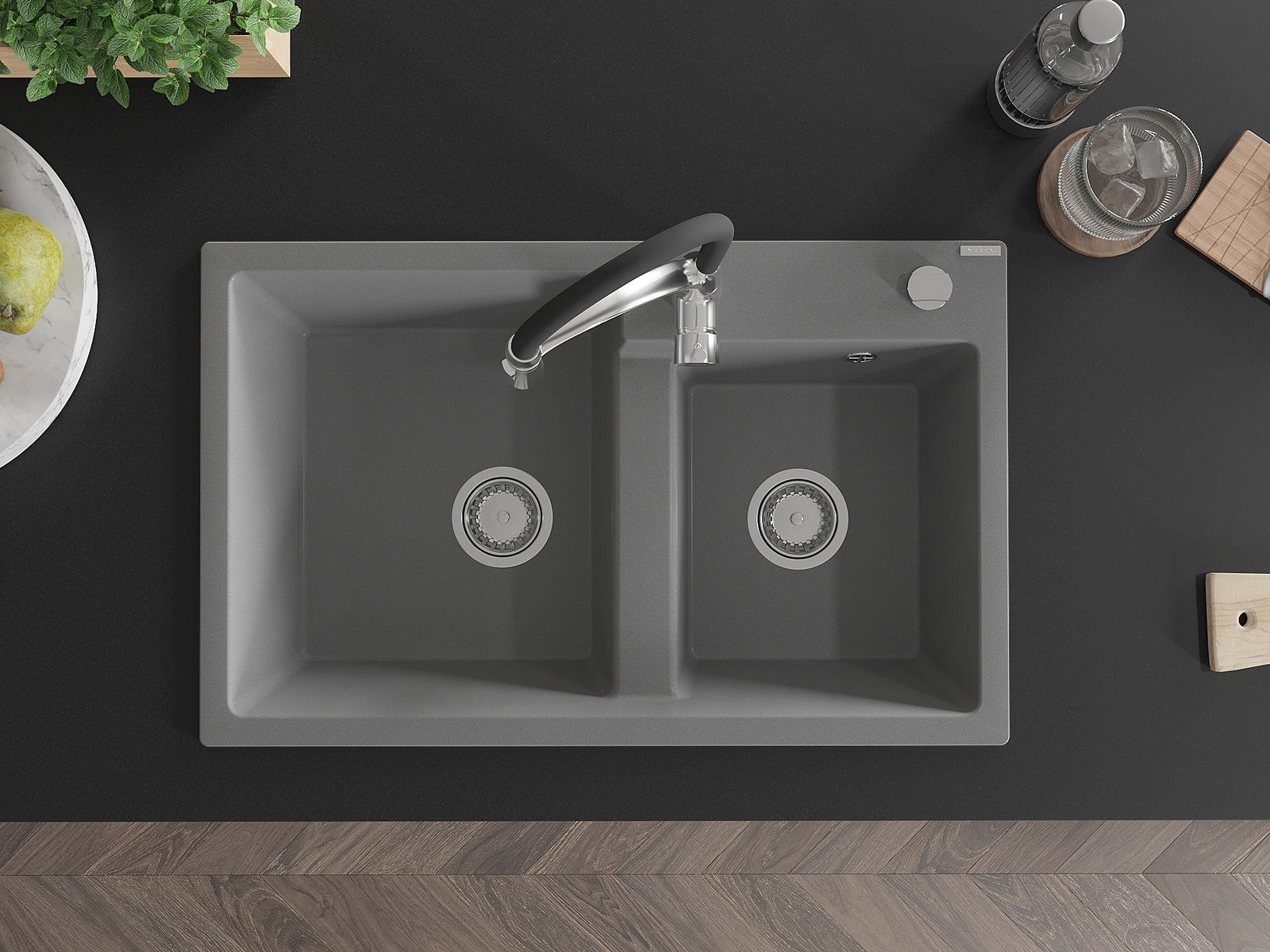 Mexen Tomas granieten spoelbak met 2 compartimenten en keukenmengkraan Aster, grijs - 6516-71-73450-07