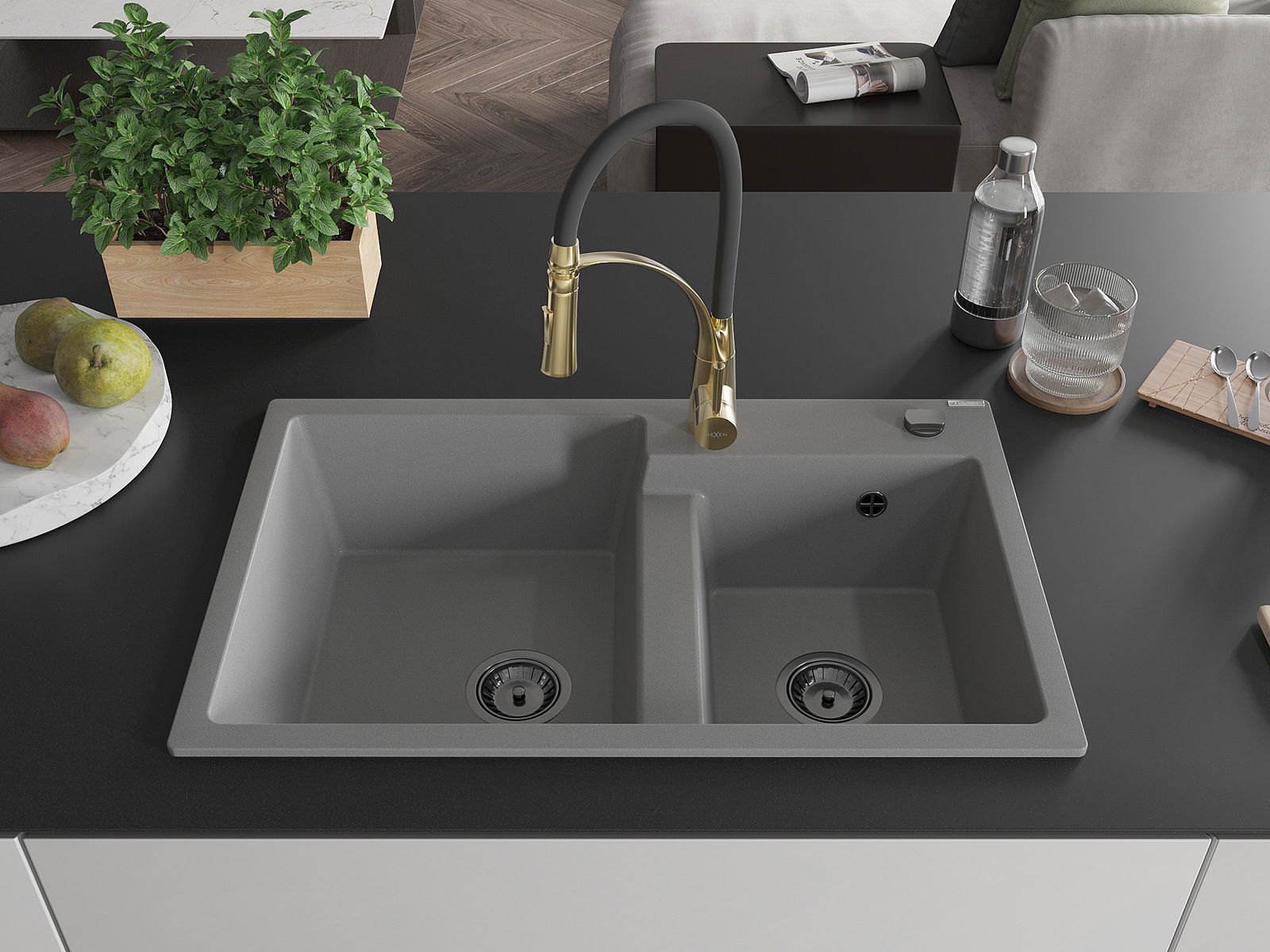 Mexen Tomas granieten gootsteen 2-kamer met keukenkraan Aster, grijs - 6516-71-73450-57-B