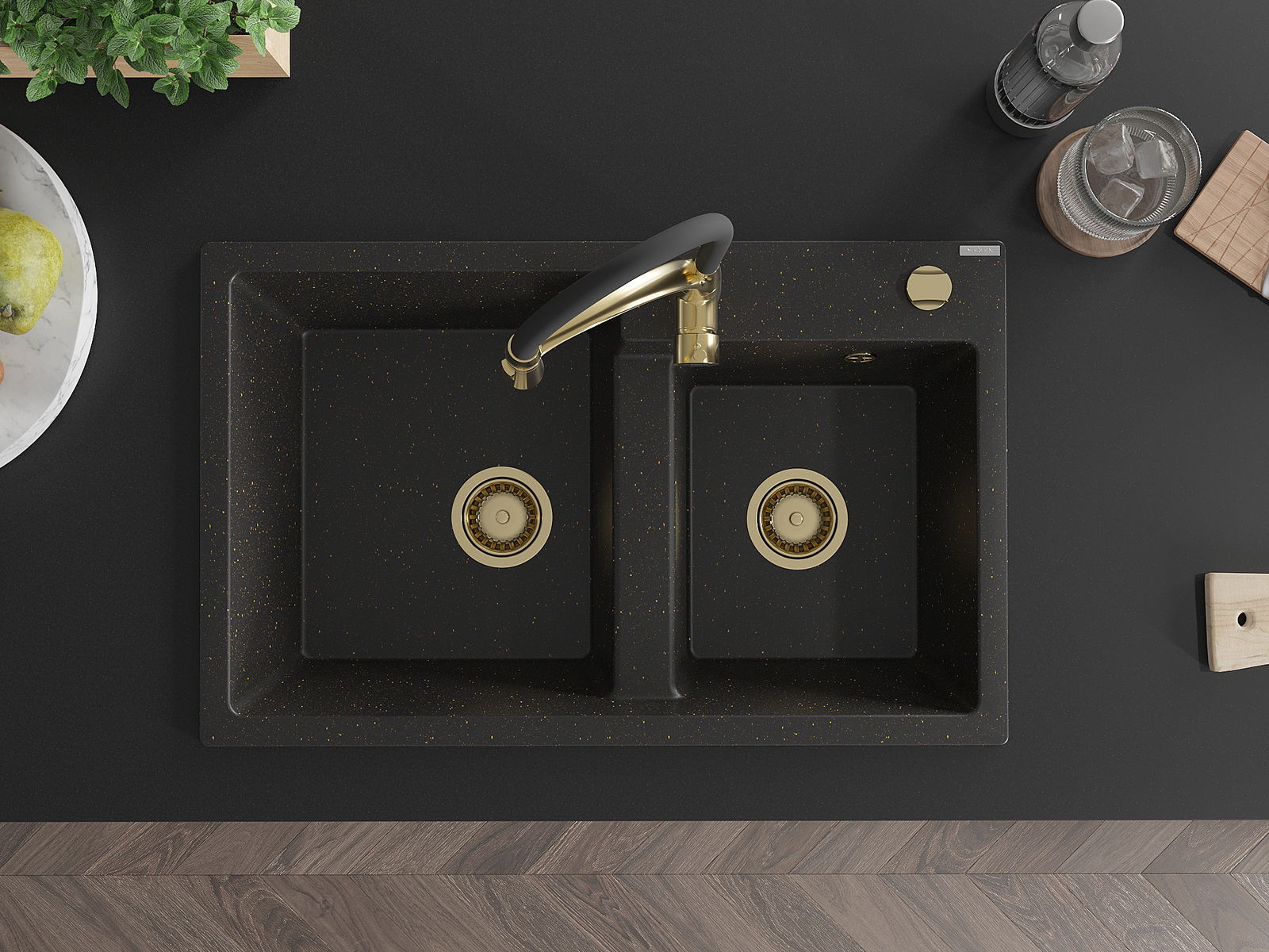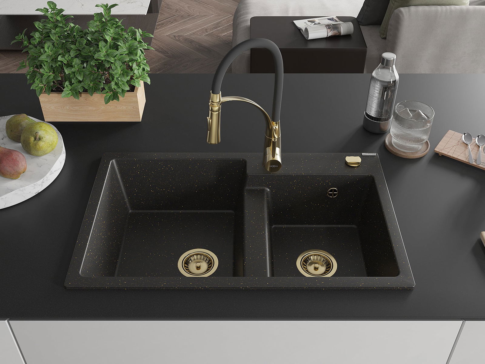 Mexen Tomas granieten spoelbak met 2 kommen en keukenkraan Aster, zwart/goud metallic - 6516-75-73450-57-G