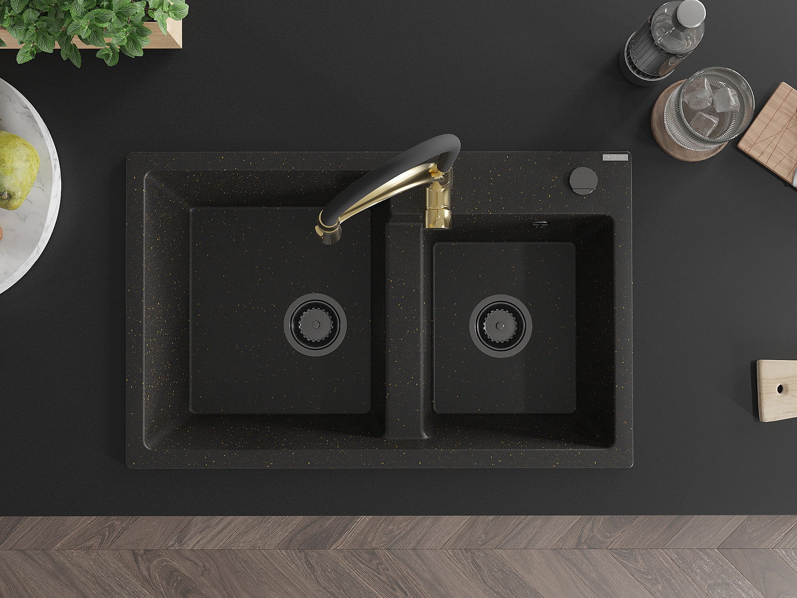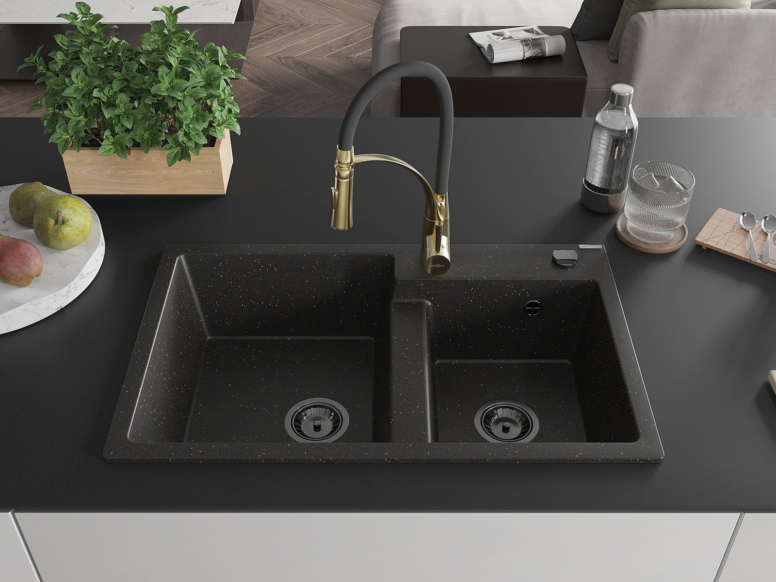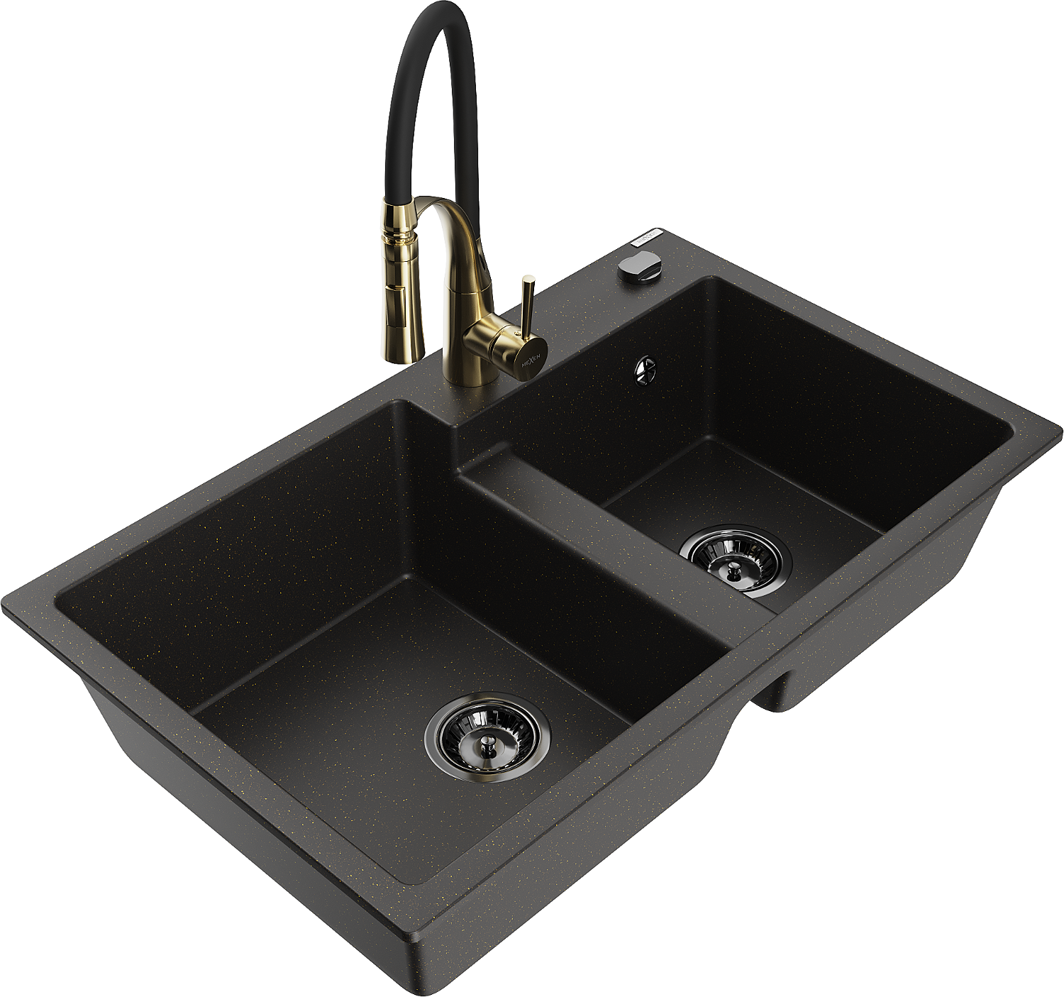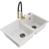 Mexen Tomas granieten gootsteen met 2 spoelbakken en keukenmengkraan Aster, zwart/gouden metallic - 6516-75-73450-57-B