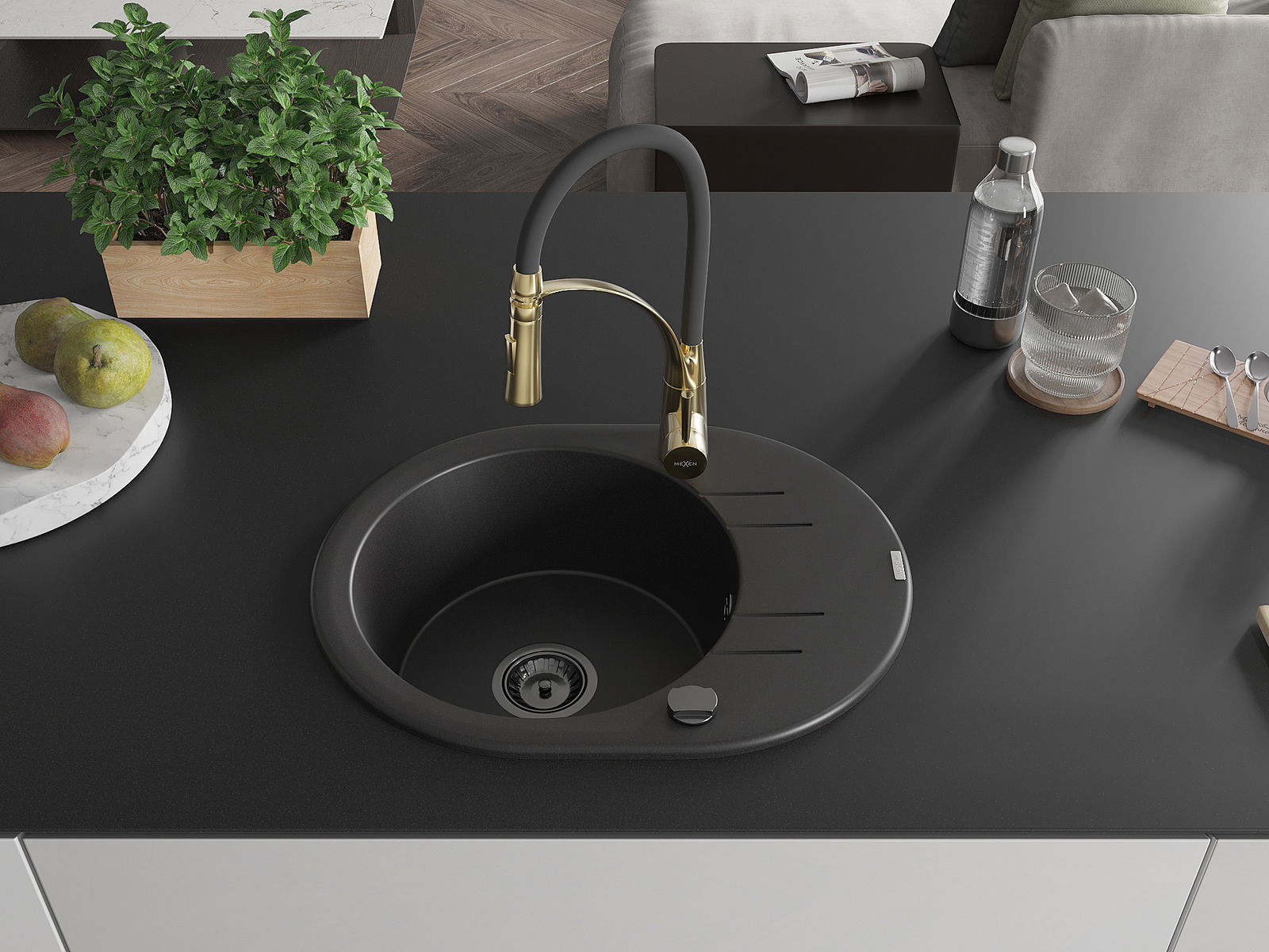 Mexen Kevin granieten spoelbak 1-kompartiment met afdruiprek en keukenkraan Aster, zwart - 6517-77-73450-57-B