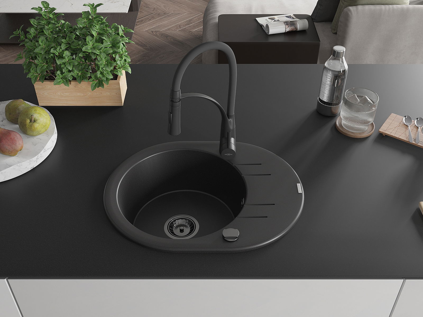 Mexen Kevin granieten spoelbak 1-komerig met afdruiprek en keukenmengkraan Aster, zwart - 6517-77-73450-70-B