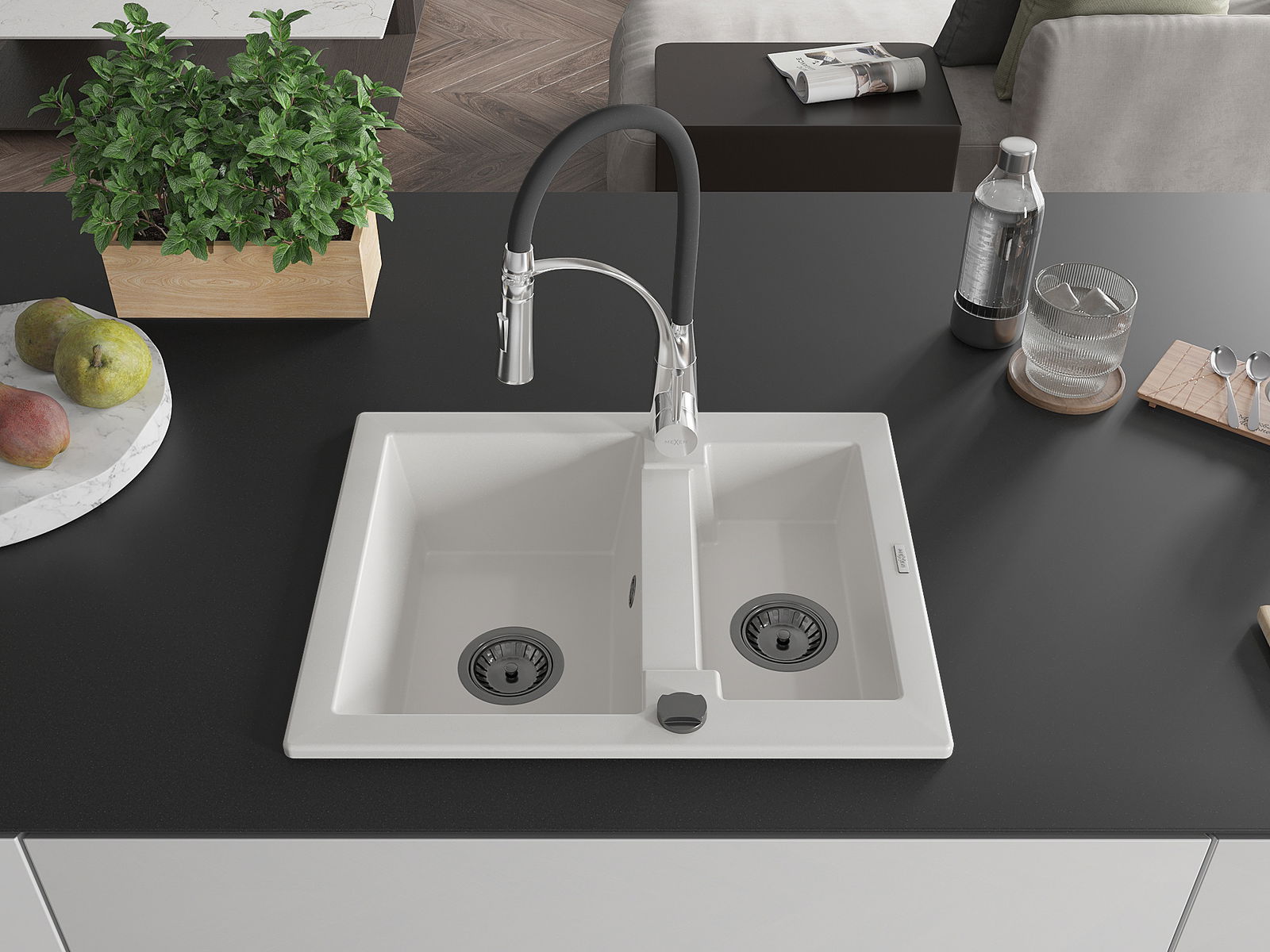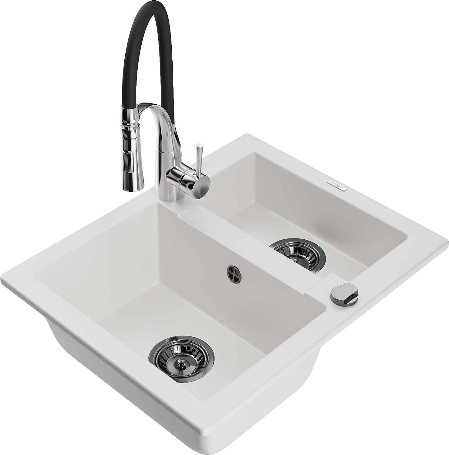 Mexen Carlos granieten spoelbak 1,5-komorige met keukenkraan Aster, wit - 6518-20-73450-07-B