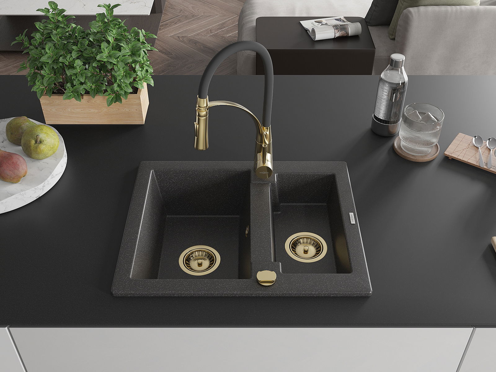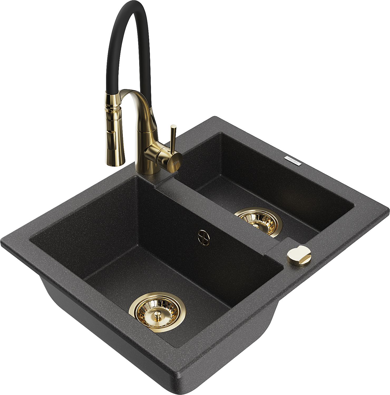 Mexen Carlos granieten gootsteen 1,5-delig met Aster keukenkraan, zwart gespikkeld - 6518-76-73450-57-G