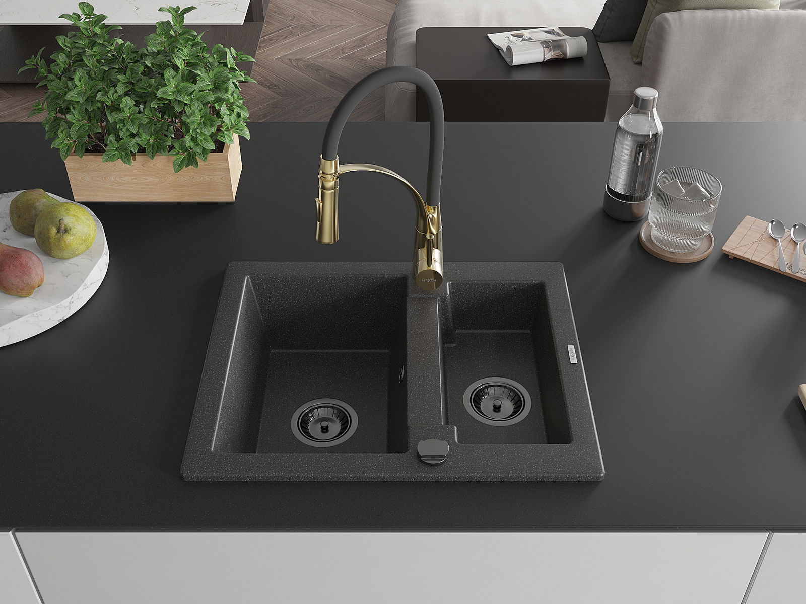 Mexen Carlos granieten spoelbak 1,5-kamer met keukenmengkraan Aster, zwart gespikkeld - 6518-76-73450-57-B