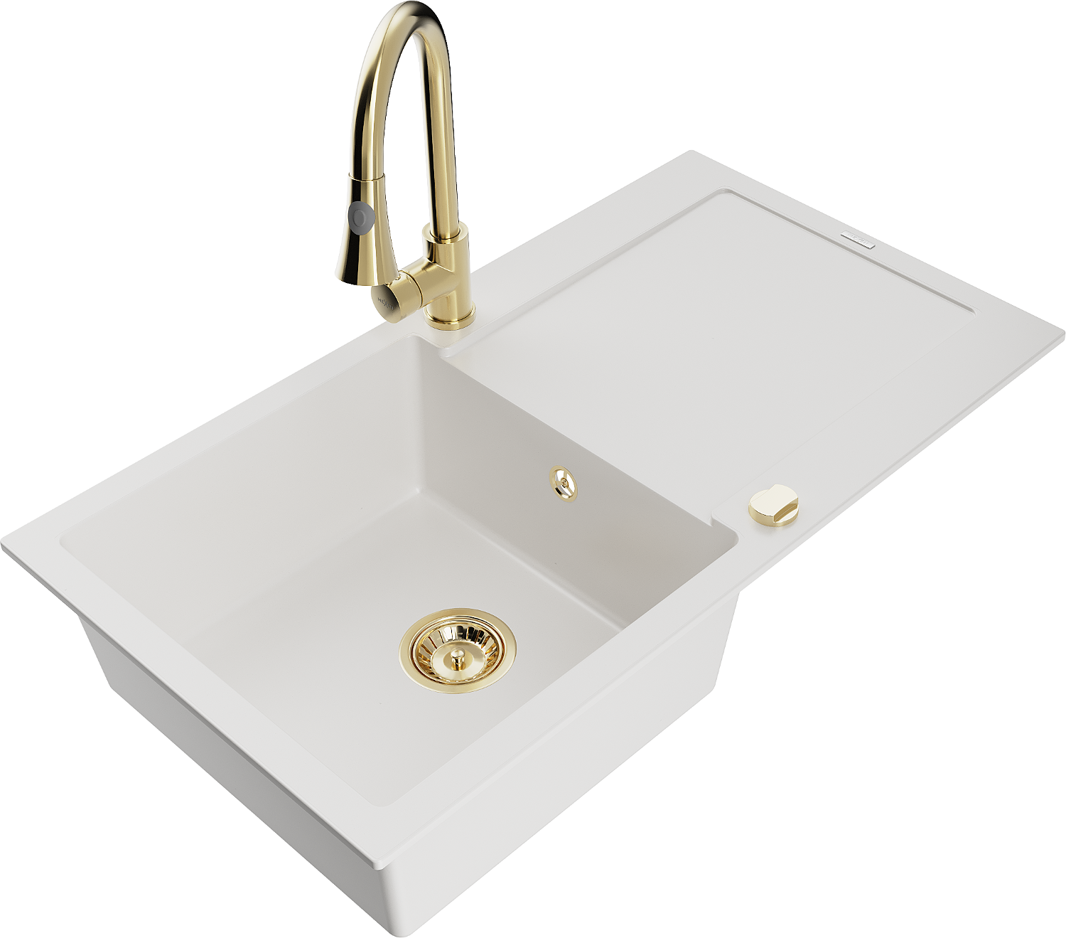 Mexen Leo granieten spoelbak 1-komor met afdruiprek en keukenmengkraan Elia, wit - 6501-20-670101-50