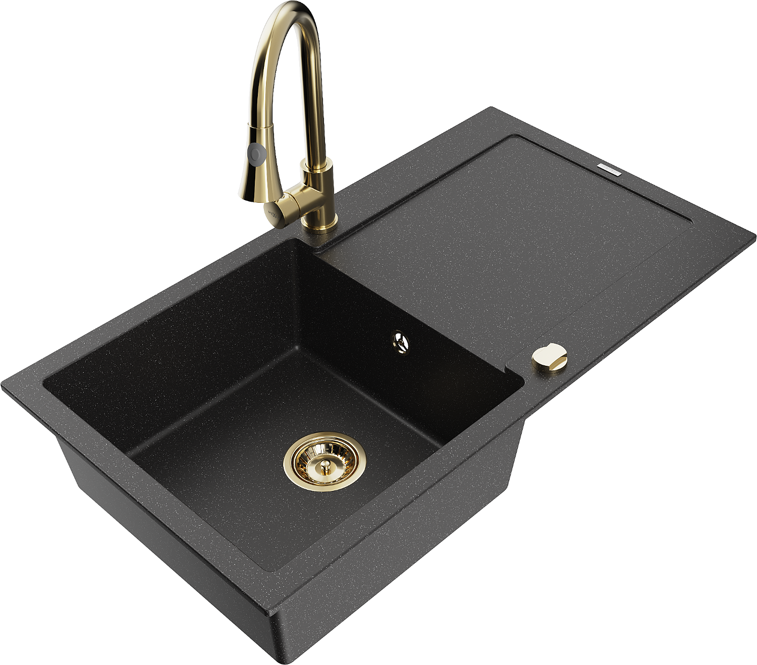 Mexen Leo granieten spoelbak 1-kompartment met afdruiprek en keukenmengkraan Elia, zwart/zilver metallic - 6501-73-670101-50
