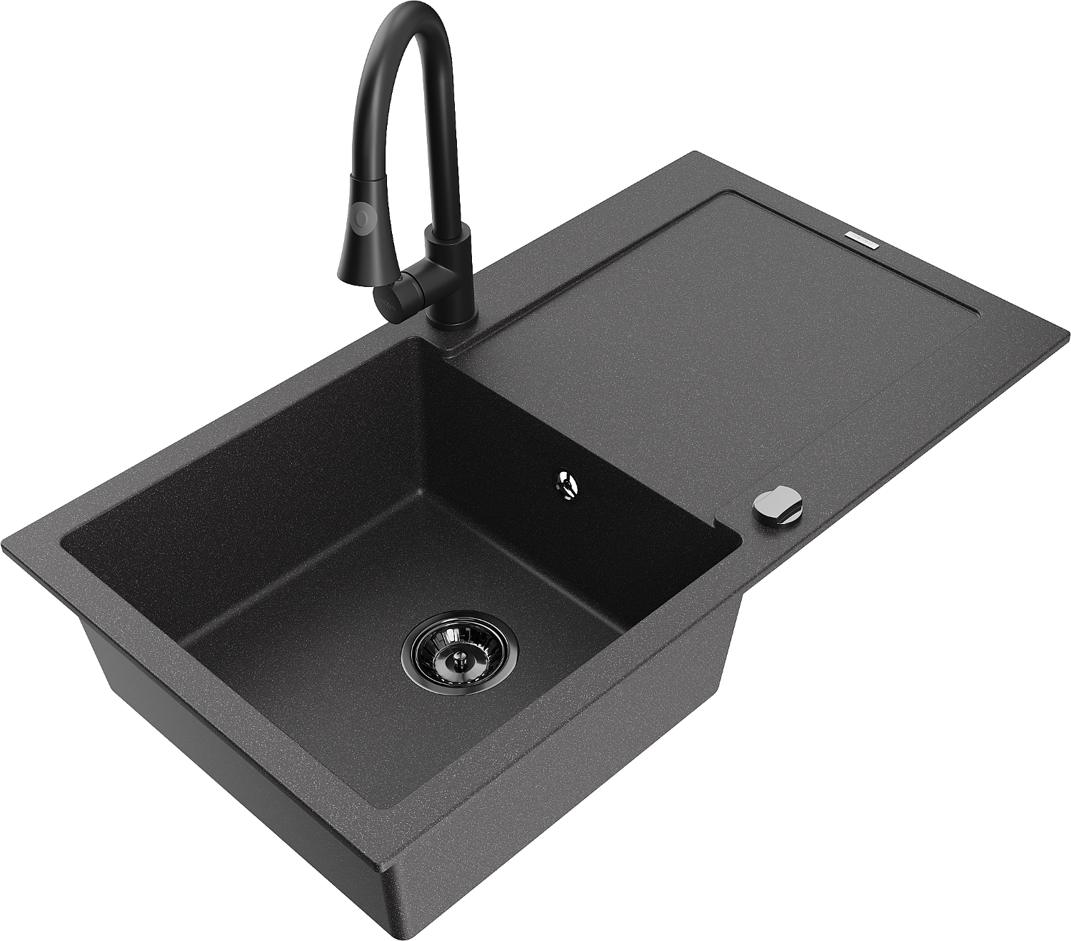 Mexen Leo granieten gootsteen 1-komorige met afdruiprek en keukenmengkraan Elia, zwart gespetterd - 6501-76-670101-70-B