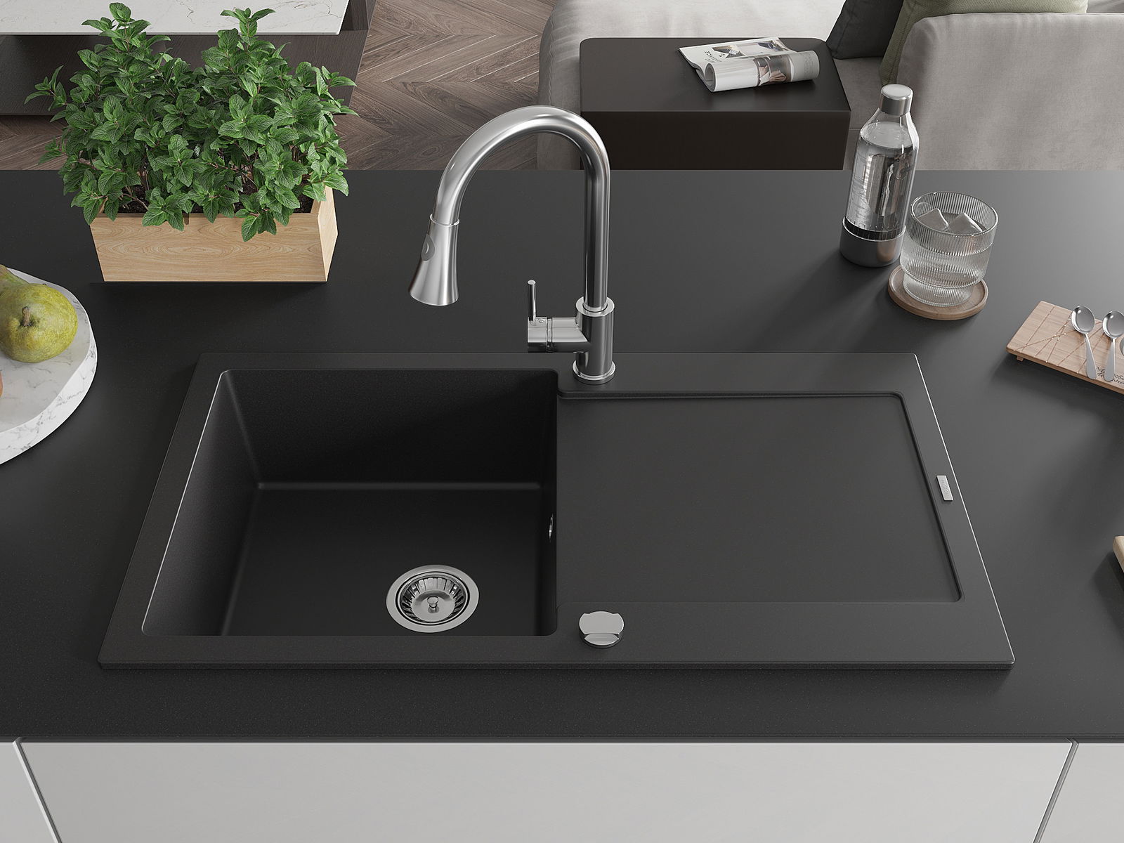De gootsteen is gemaakt van hoogwaardig graniet. Het vormt een elegante en vooral praktische aanvulling op elke keuken, ongeacht de stijl. De hoge kwaliteit en duurzaamheid van graniet zorgen voor jarenlang gebruik.