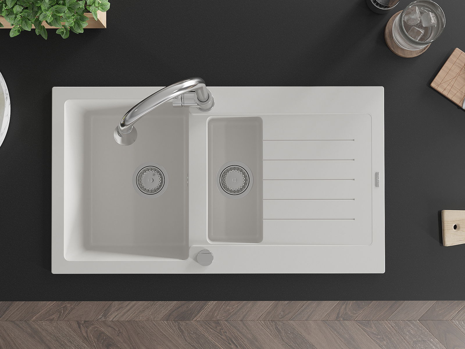 Mexen Matias granieten gootsteen 1,5-komerig met afdruiprek en keukenmengkraan Elia, wit - 6502-20-670101-00