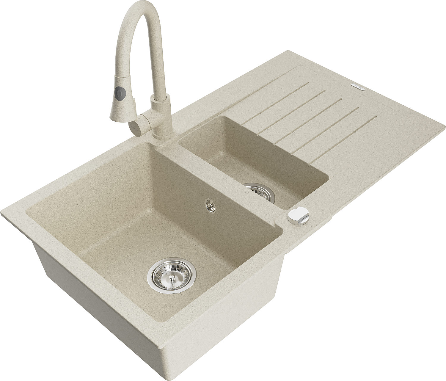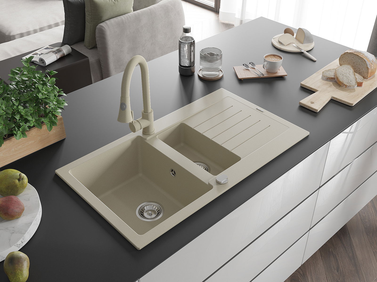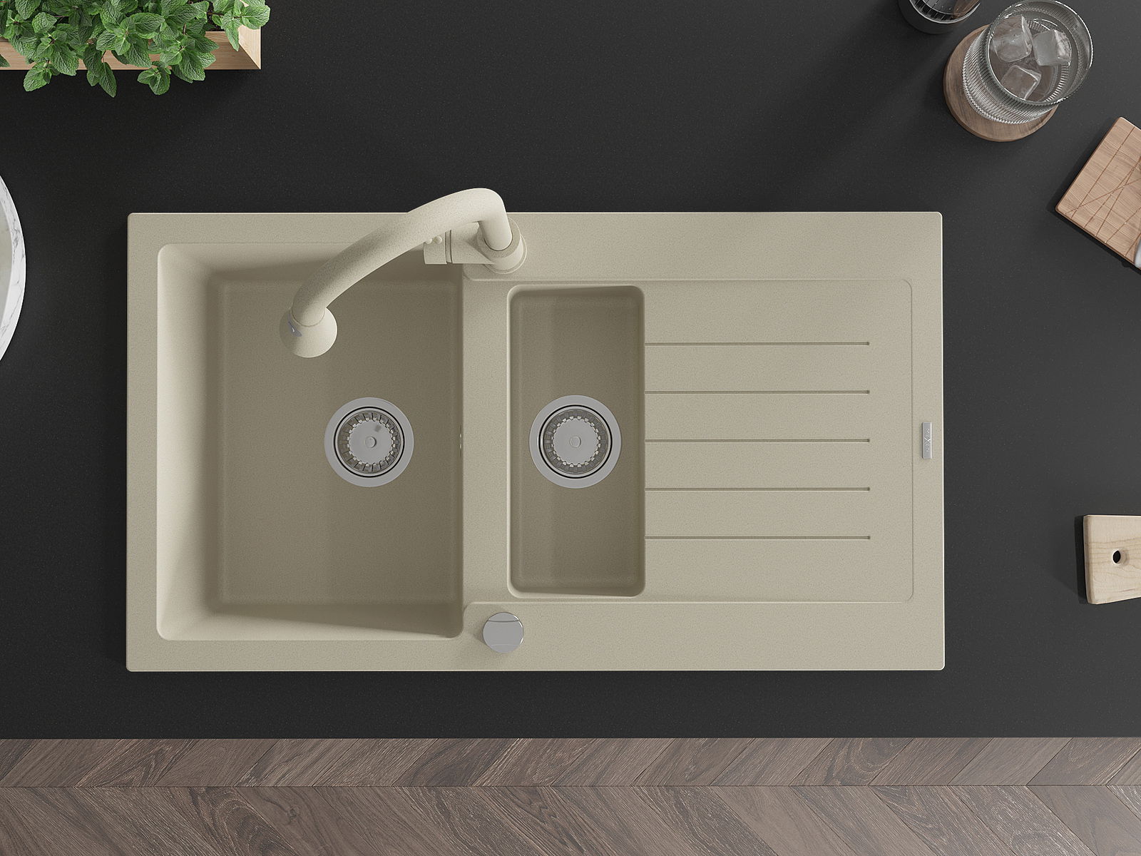 Mexen Matias granieten gootsteen 1,5-komor met afdruiprek en keukenmengkraan Elia, beige - 6502-69-670101-69