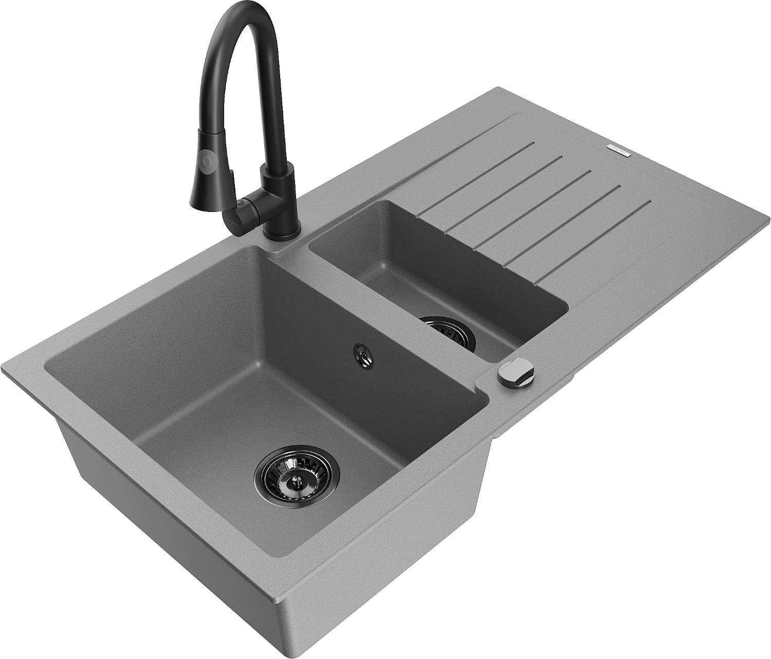 Mexen Matias granieten gootsteen met 1,5 kamers, afdruiprek en Elia keukenmengkraan, grijs - 6502-71-670101-70-B