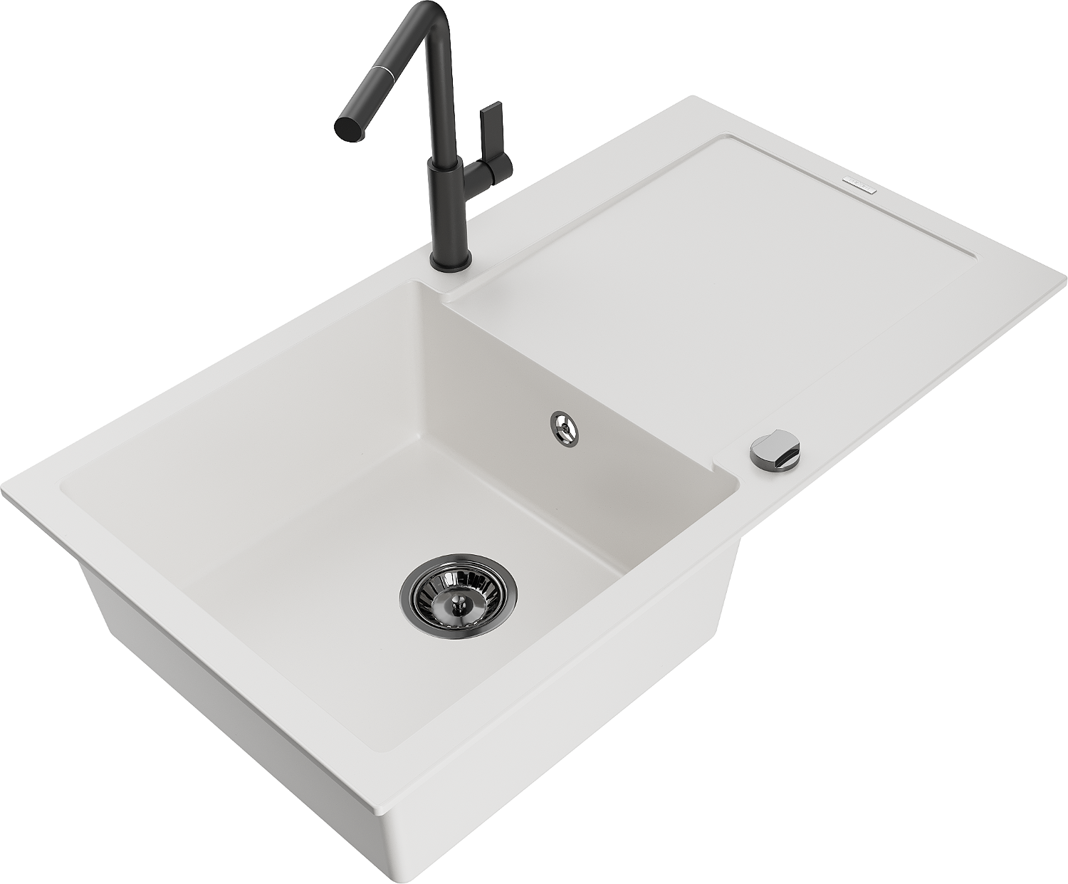 Mexen Leo granieten spoelbak met 1 bak en afdruiprek en keukenmengkraan Flora, wit - 6501-20-670401-70-B