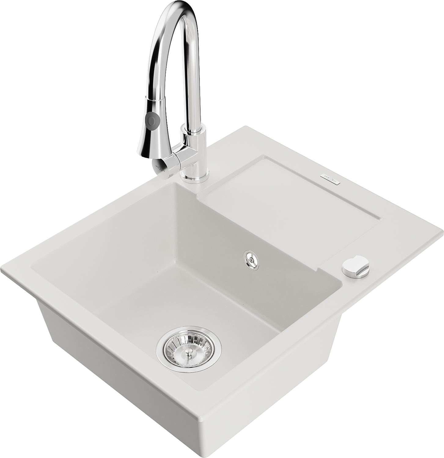 Mexen Enzo granieten spoelbak met 1 compartiment, afdruiprek en keukenmengkraan Elia, wit - 6506-20-670101-00