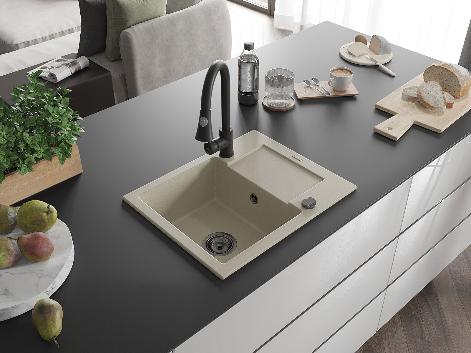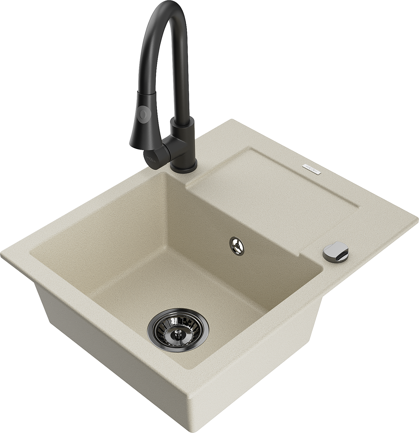 Mexen Enzo granieten gootsteen 1-komorig met druiprek en keukenmengkraan Elia, beige - 6506-69-670101-70
