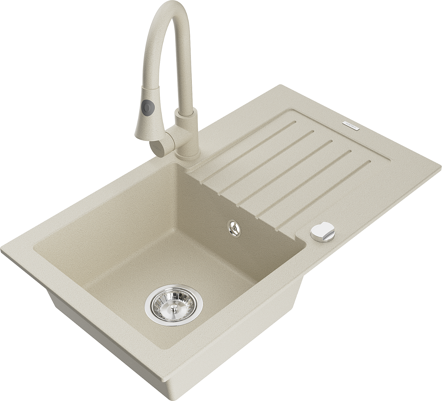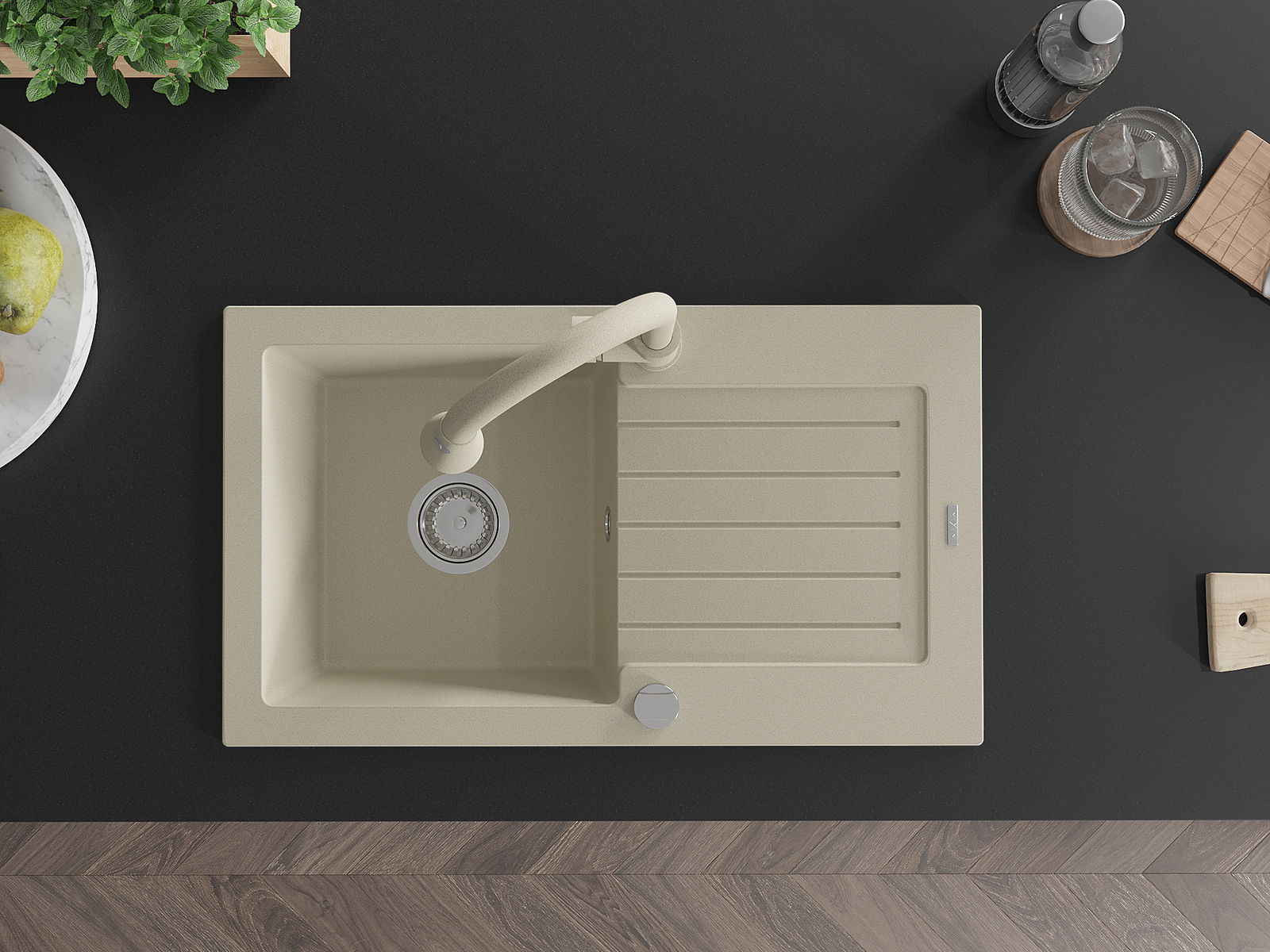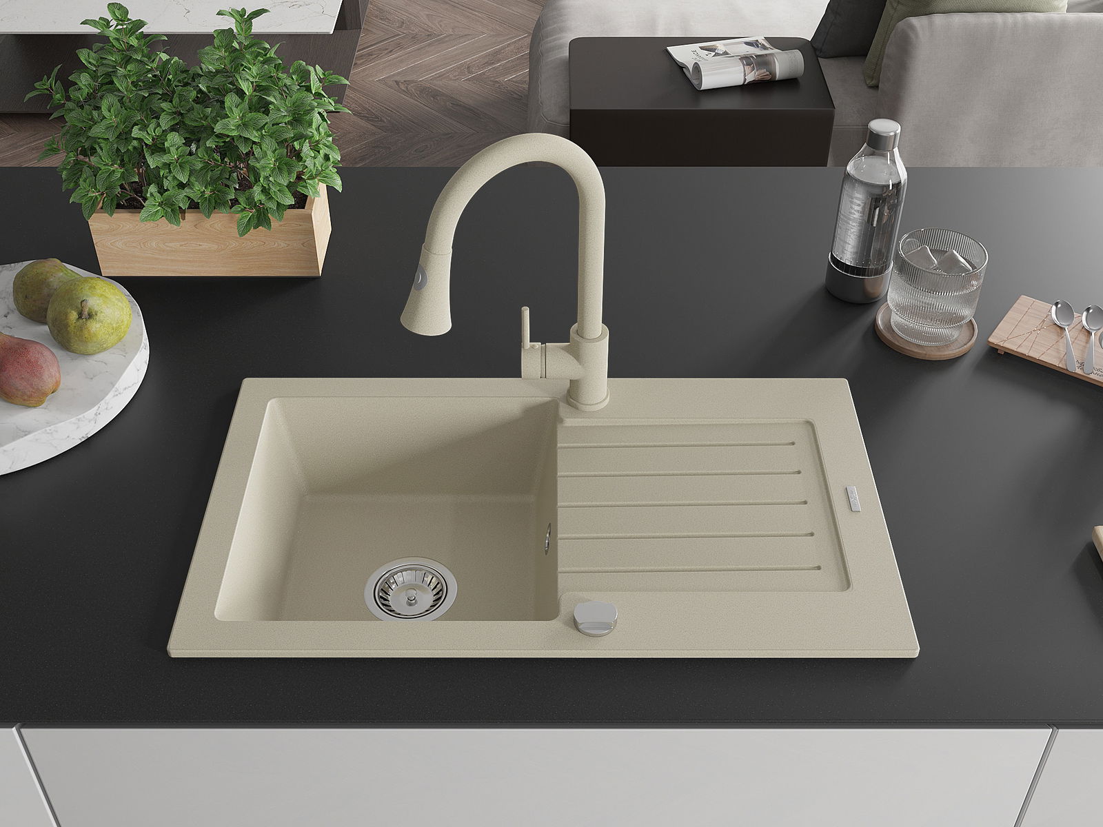 Mexen Pablo granieten spoelbak 1-komor met afdruiprek en keukenmengkraan Elia, beige - 6510-69-670101-69