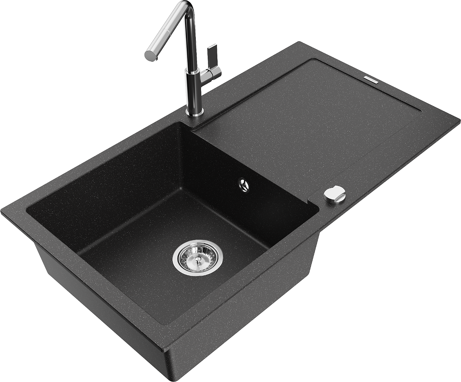Mexen Leo granieten spoelbak 1-komerig met afdruiprek en keukenkraan Flora, zwart/zilveren metallic - 6501-73-670401-00