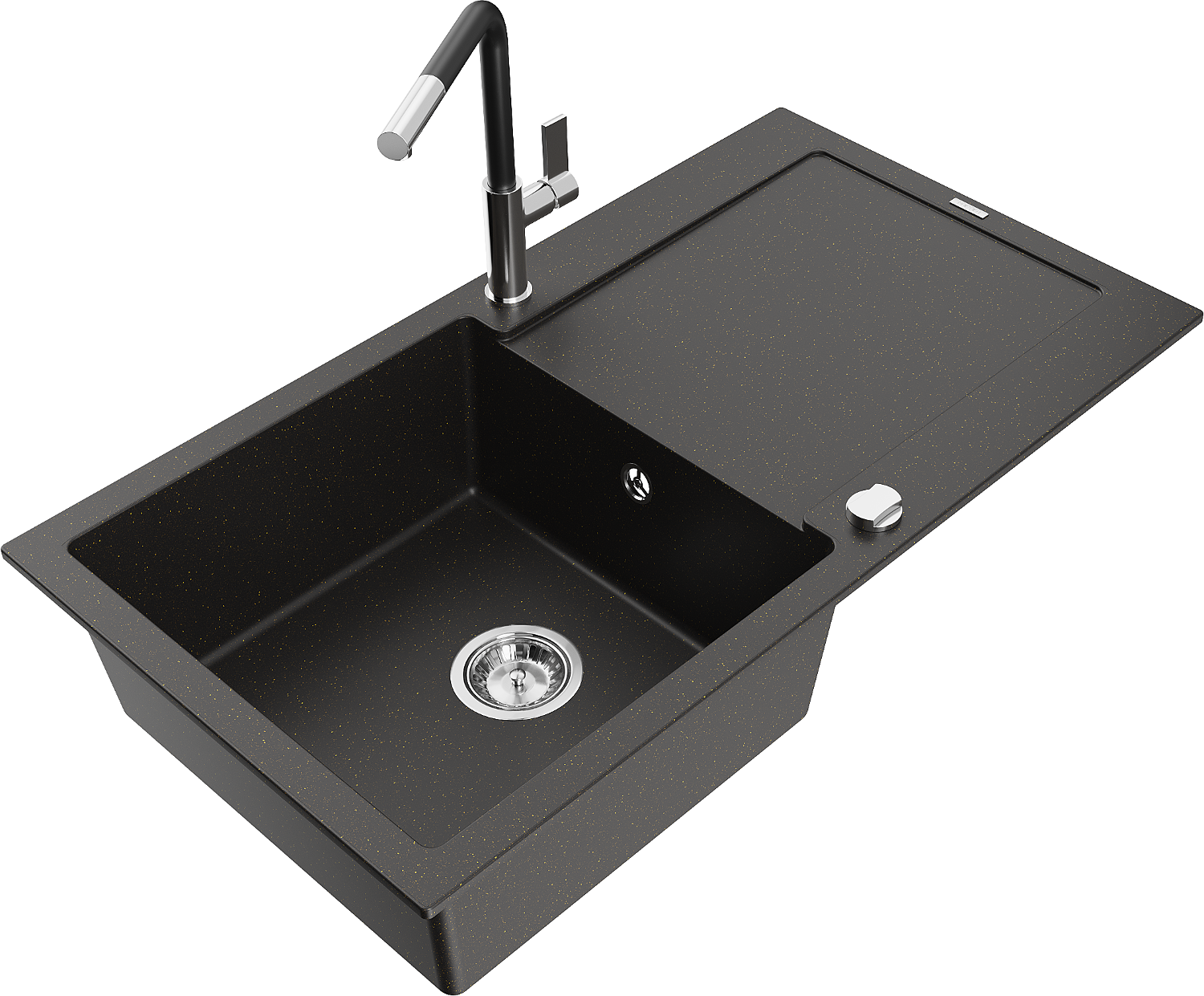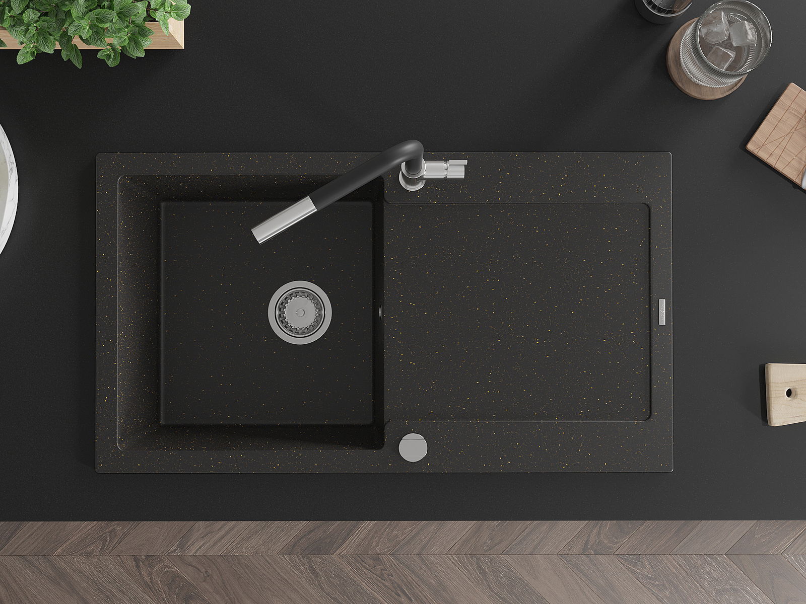 Mexen Leo granieten gootsteen 1-kompartment met afdruiprek en keukenkraan Flora, zwart/gouden metallic - 6501-75-670401-07