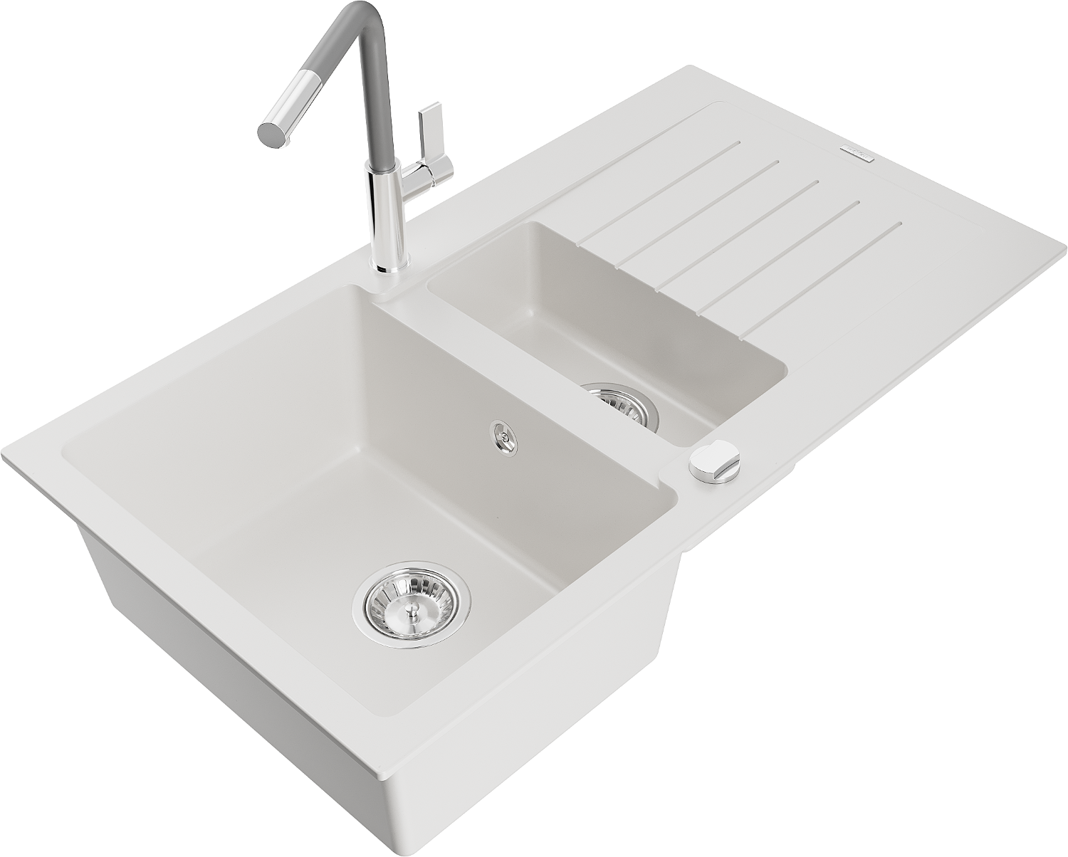 Mexen Matias granieten gootsteen 1,5-komor met afdruiprek en keukenkraan Flora, wit - 6502-20-670401-06