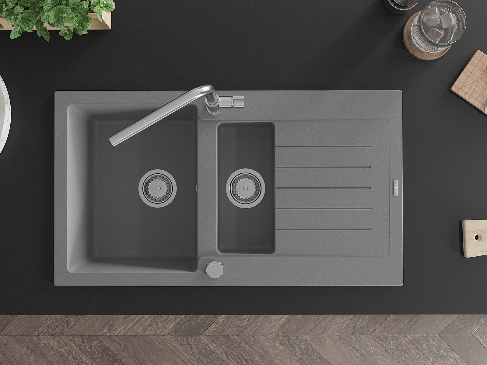 Mexen Matias granieten spoelbak 1,5-komor met afdruiprek en keukenmengkraan Flora, grijs - 6502-71-670401-00