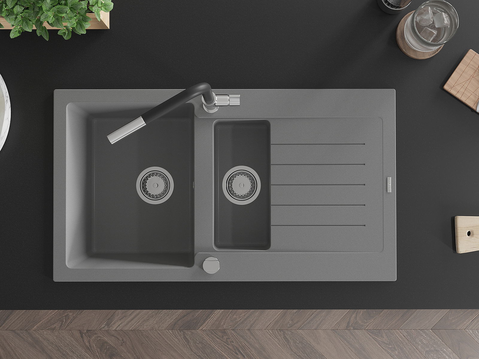 Mexen Matias granieten spoelbak 1,5-kamerig met afdruiprek en keukenmengkraan Flora, grijs - 6502-71-670401-07