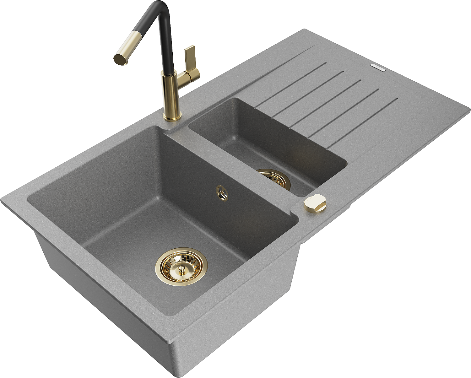 Mexen Matias granieten spoelbak 1,5-vaks met afdruipgedeelte en keukenkraan Flora, grijs - 6502-71-670401-57-G