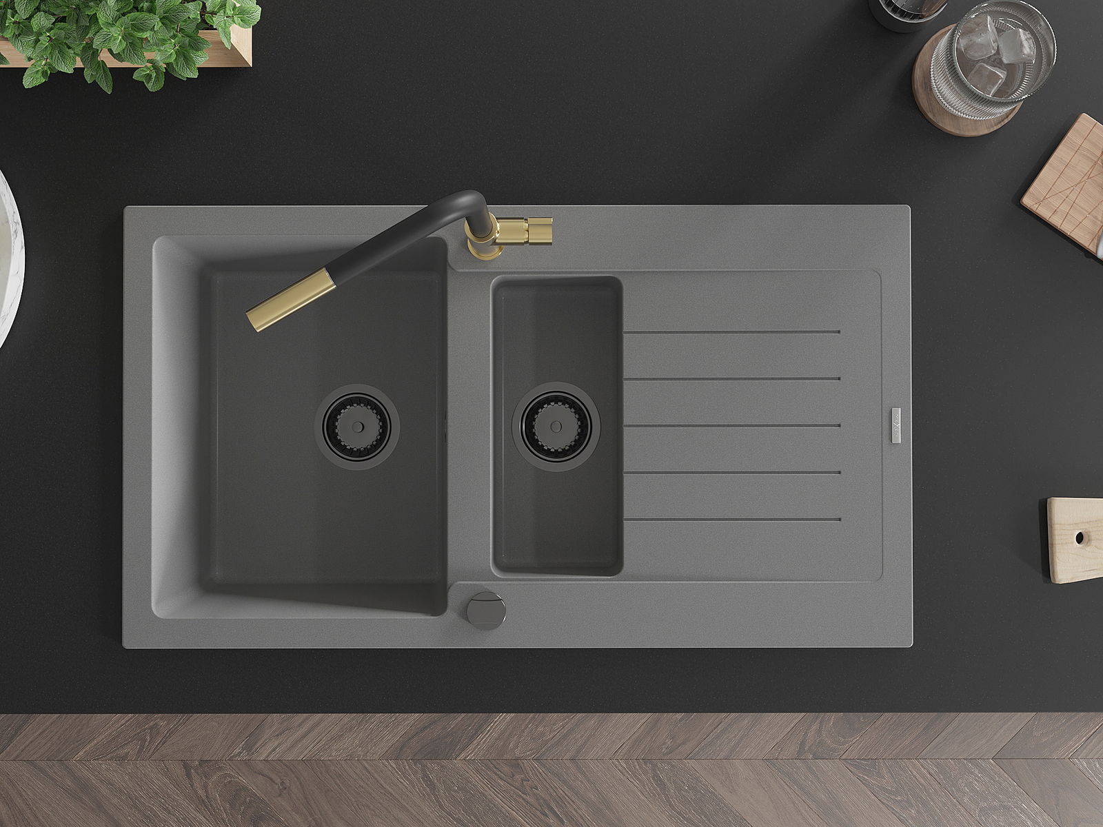 Mexen Matias granieten spoelbak 1,5-kompartement met afdruiprek en keukenmengkraan Flora, grijs - 6502-71-670401-57-B