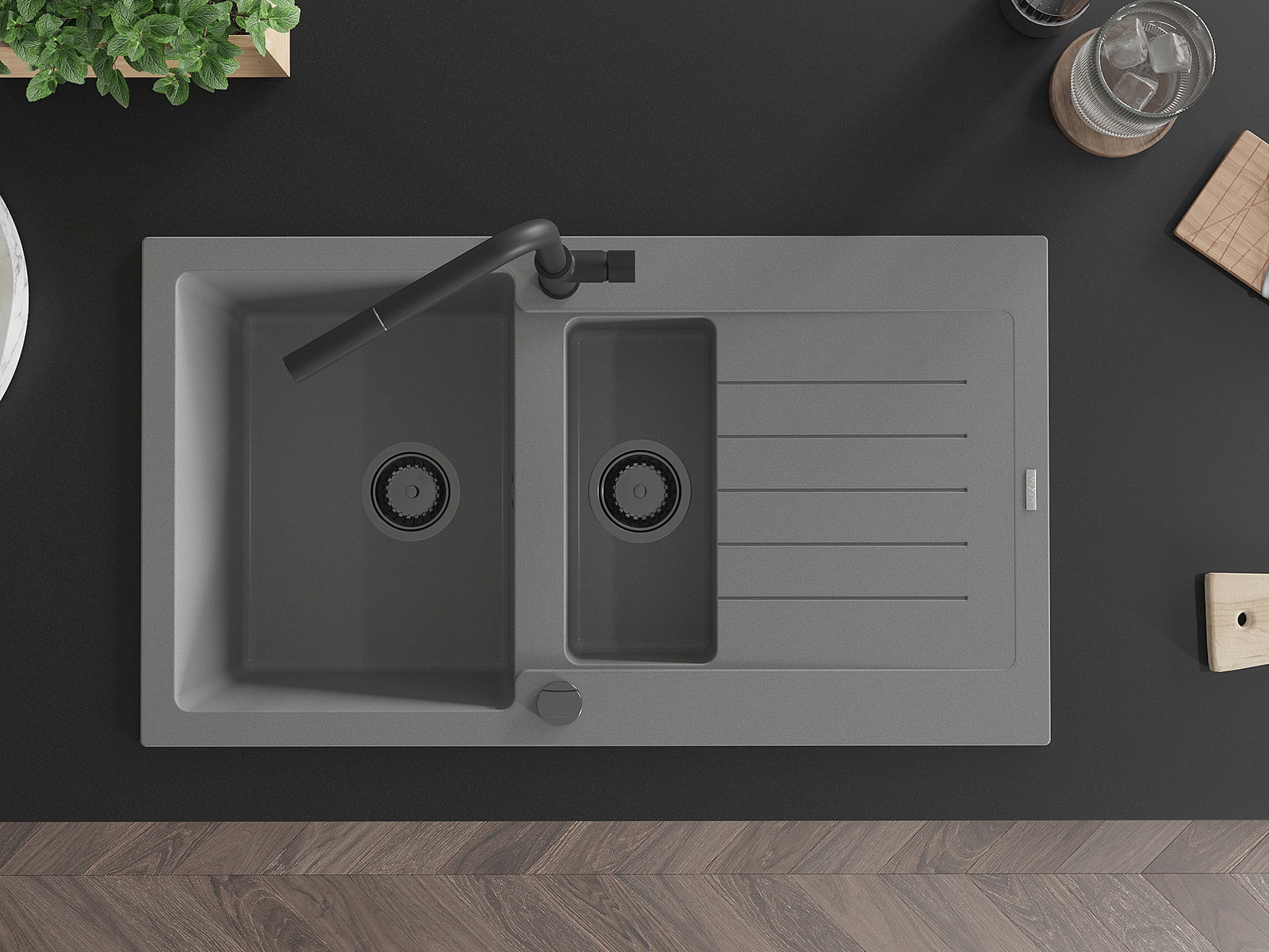 Mexen Matias granieten spoelbak 1,5-komore met afdruiprek en keukenmengkraan Flora, grijs - 6502-71-670401-70-B
